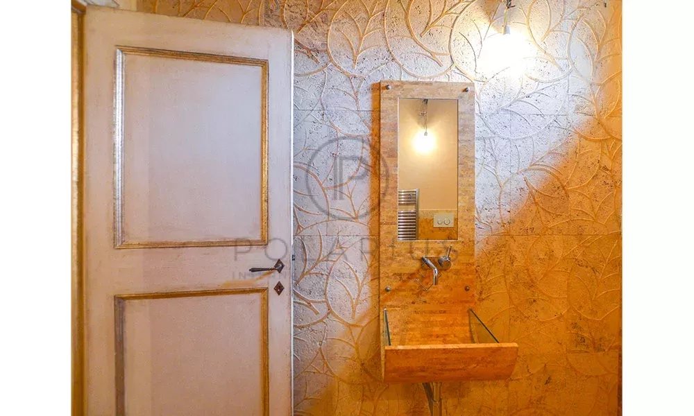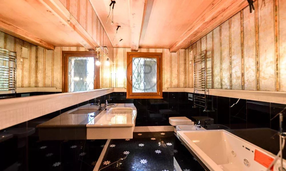 Wenn Sie eine Marmortreppe hinaufsteigen, gelangen Sie auf einen Treppenabsatz, bei dem es sich möglicherweise um eine zweite kleine und private Lounge handelt. Von hier aus haben Sie Zugang zum Hauptschlafzimmer mit eigenem Bad mit Badewanne, das durch ein maßgeschneidertes Mosaik gekennzeichnet ist. Die Wände im Badezimmer scheinen mit Tapeten bedeckt zu sein, tatsächlich sind sie jedoch komplett handbemalt. Auf dieser Etage befinden sich 3 weitere Doppelschlafzimmer, 1 davon mit eigenem Bad. Die anderen beiden Schlafzimmer teilen sich ein Badezimmer. Beide Badezimmer verfügen über komplett maßgeschneiderte Details. Die Bodenbeläge sind hier aus Holz.