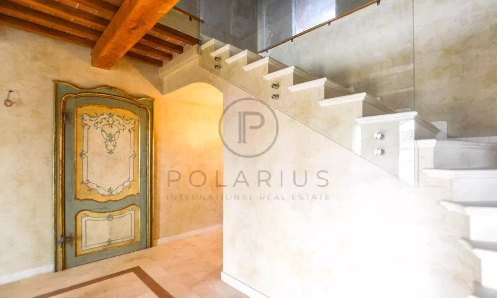 Sie betreten das Haus durch eine schöne gewölbte Tür, und wenn Sie rechts abbiegen, werden Sie sofort von den Lichtstrahlen umarmt, die durch die riesigen Fenster des Doppelwohnzimmers fallen, von dem aus Sie einen wunderschönen Blick über die sanften Hügel und das mittelalterliche Dorf genießen können. Von hier aus können Sie hinausgehen und sich im Schatten der großen Pergola niederlassen, die sich hervorragend zum Aufstellen einiger Sofas eignet. Auf derselben Etage befinden sich ein Studio, 2 Gästebäder und eine voll ausgestattete Bulthaup-Küche mit Aussicht. Liebe zum Detail ist das Motto dieser Etage: Marmorböden, handbemalte antike Türen, von einem örtlichen Handwerker eingelegte Marmorverkleidungen. Die Küche verfügt über alle Top-Geräte, die Ihnen in den Sinn kommen. Aber das faszinierendste Detail ist sicherlich das riesige Fenster des Doppelwohnzimmers, das Ihnen auch im Winter das Gefühl gibt, draußen im Garten zu sein, wenn es Ihnen in Ihrem gemütlichen Zuhause warm ist.