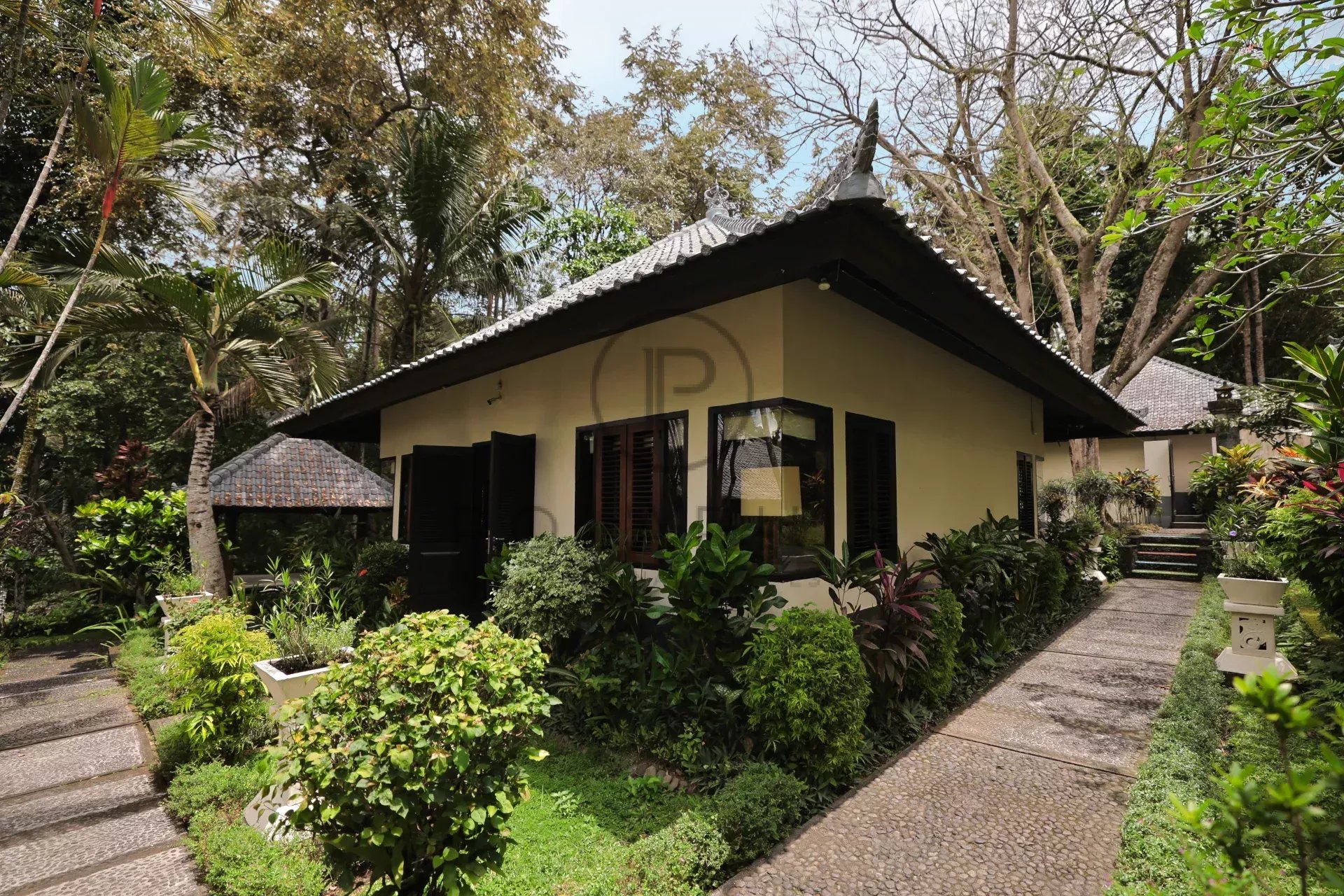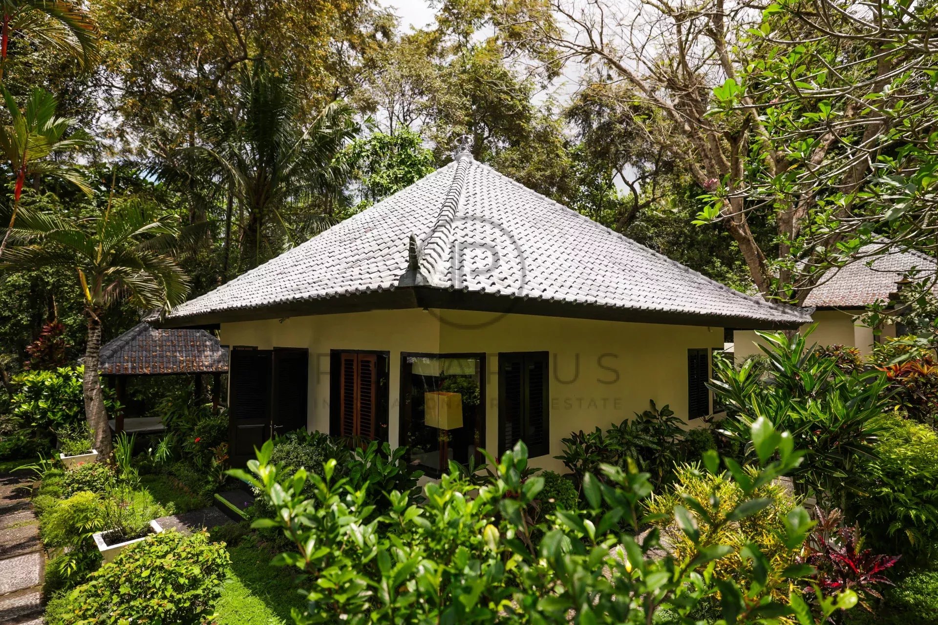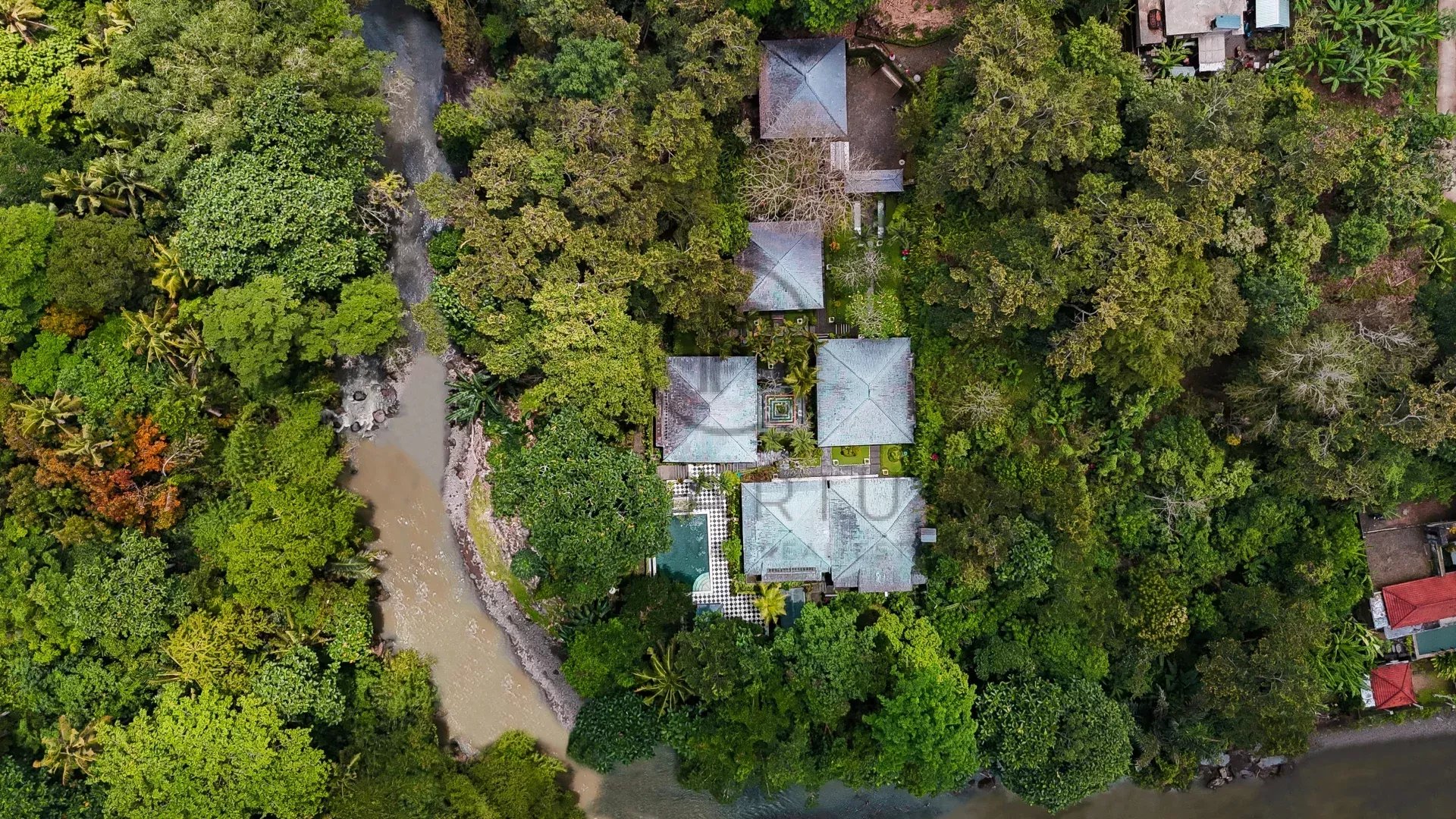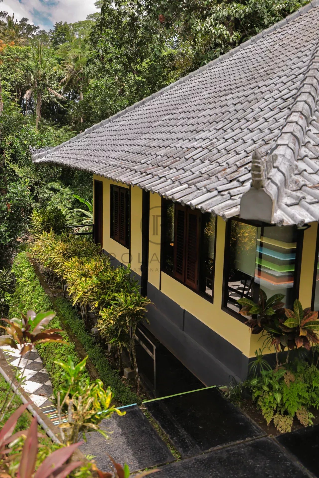 Das Anwesen liegt auf einem 4.350 m² großen Grundstück und bietet eine atemberaubende Kulisse, umgeben von tropischen Bäumen und an einer Ecke eines ewigen Flussufers gelegen, strategisch gesichert, um Balis faszinierende Naturschönheit zu bewahren.