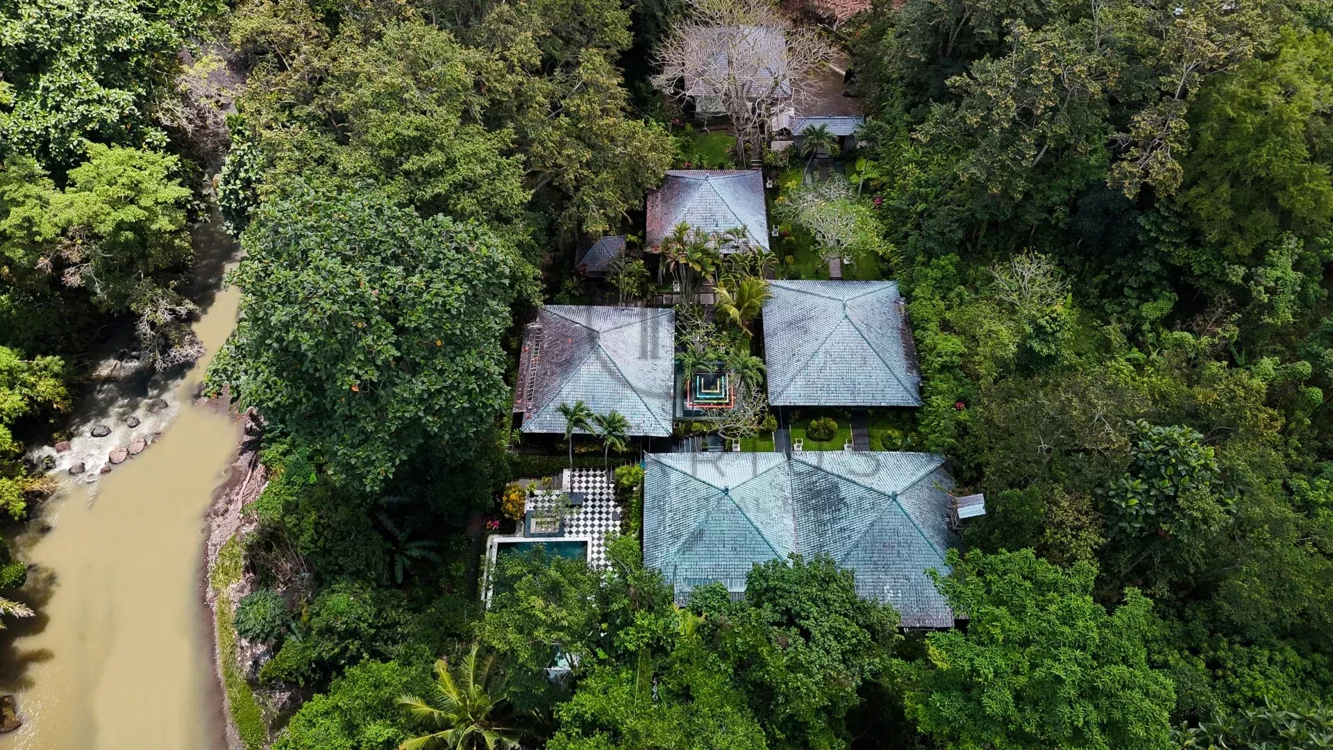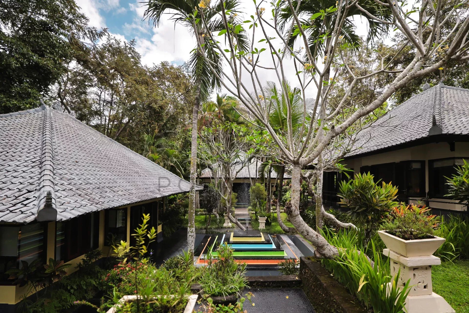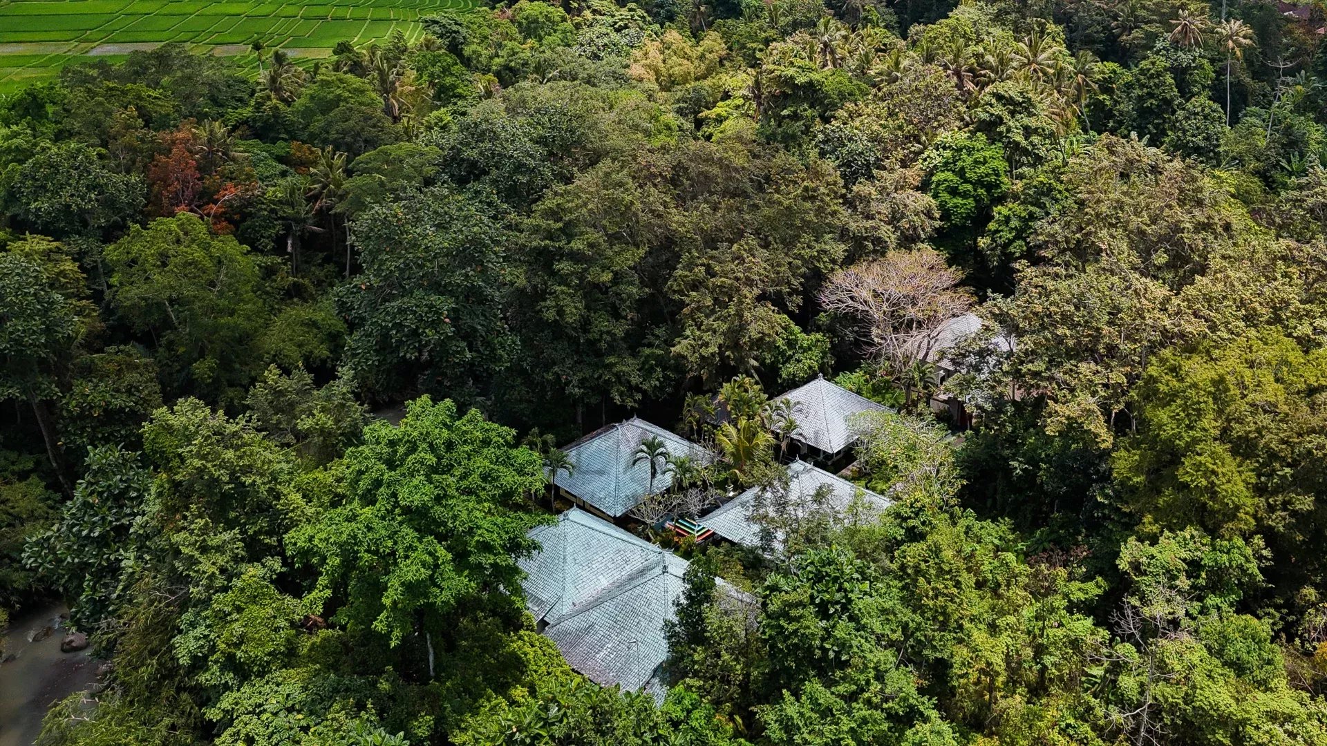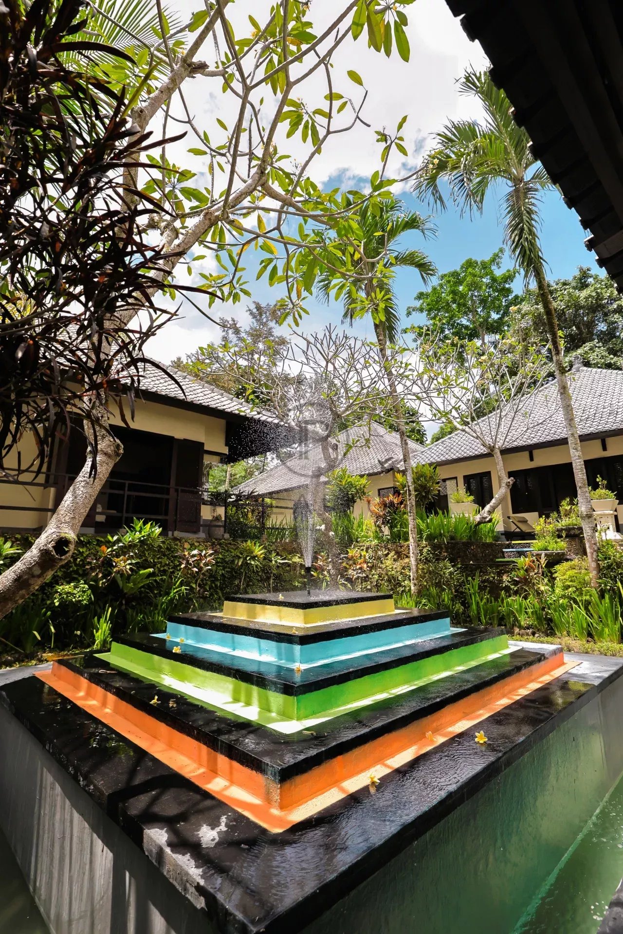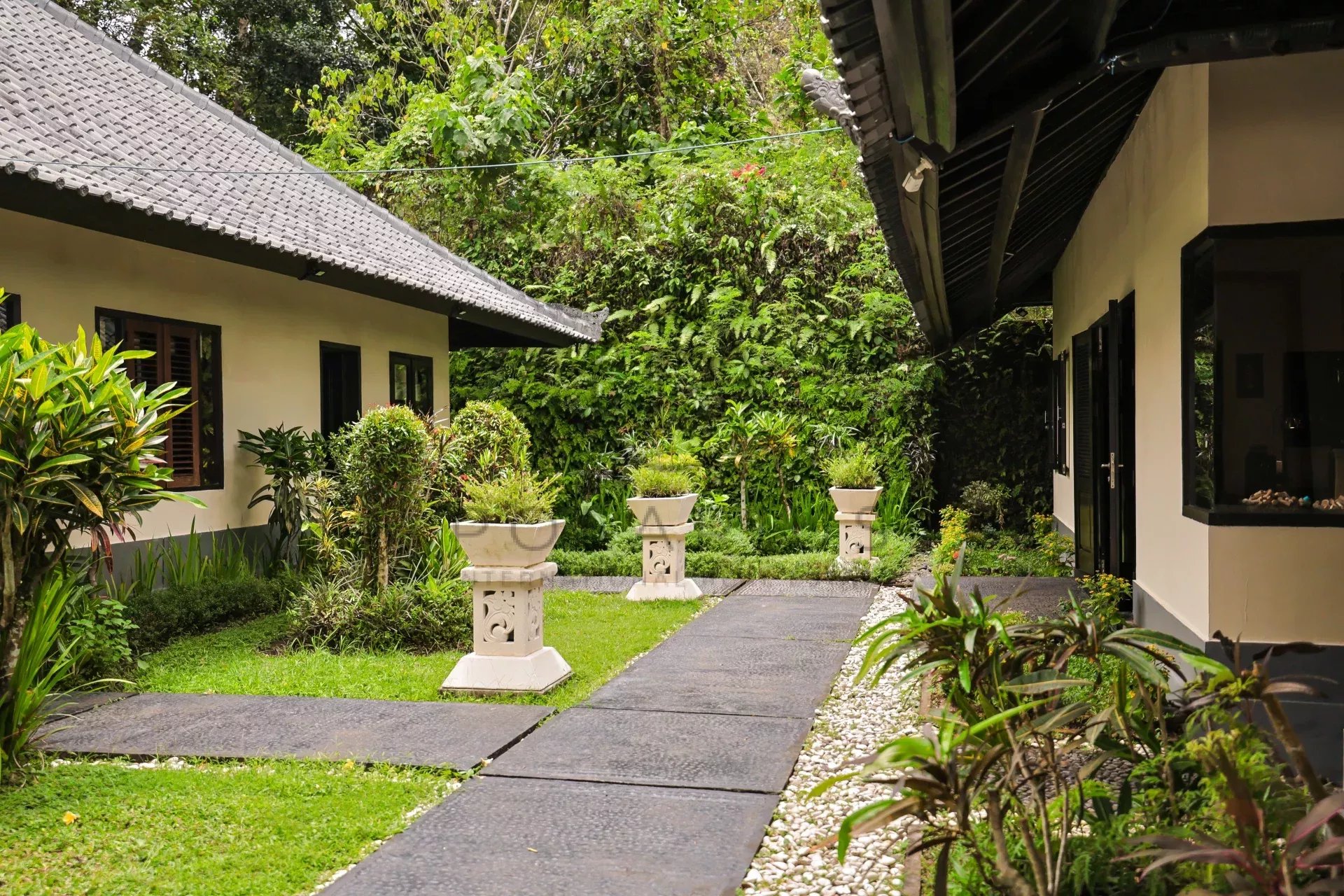 Das Anwesen liegt auf einem 4.350 m² großen Grundstück und bietet eine atemberaubende Kulisse, umgeben von tropischen Bäumen und an einer Ecke eines ewigen Flussufers gelegen, strategisch gesichert, um Balis faszinierende Naturschönheit zu bewahren.