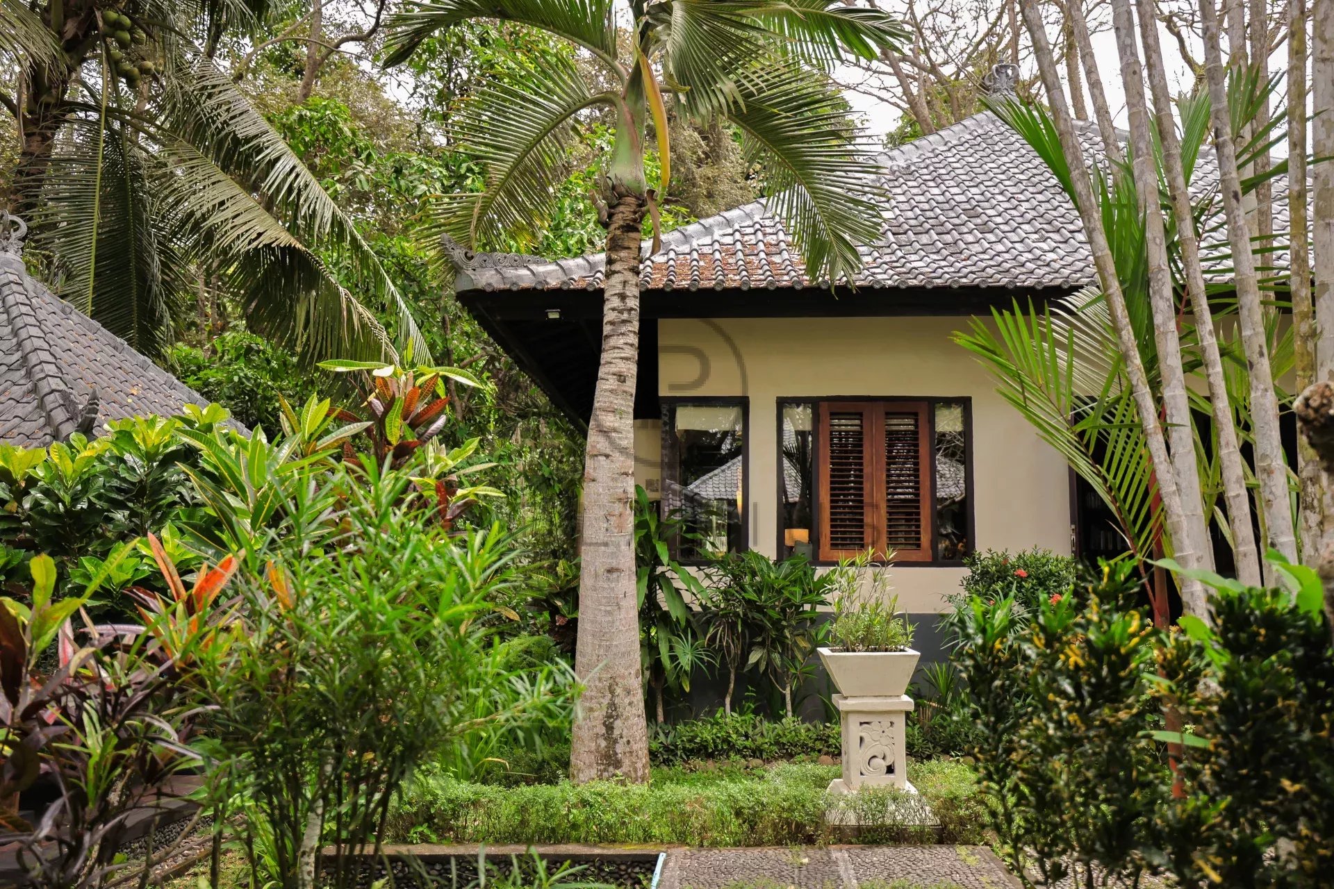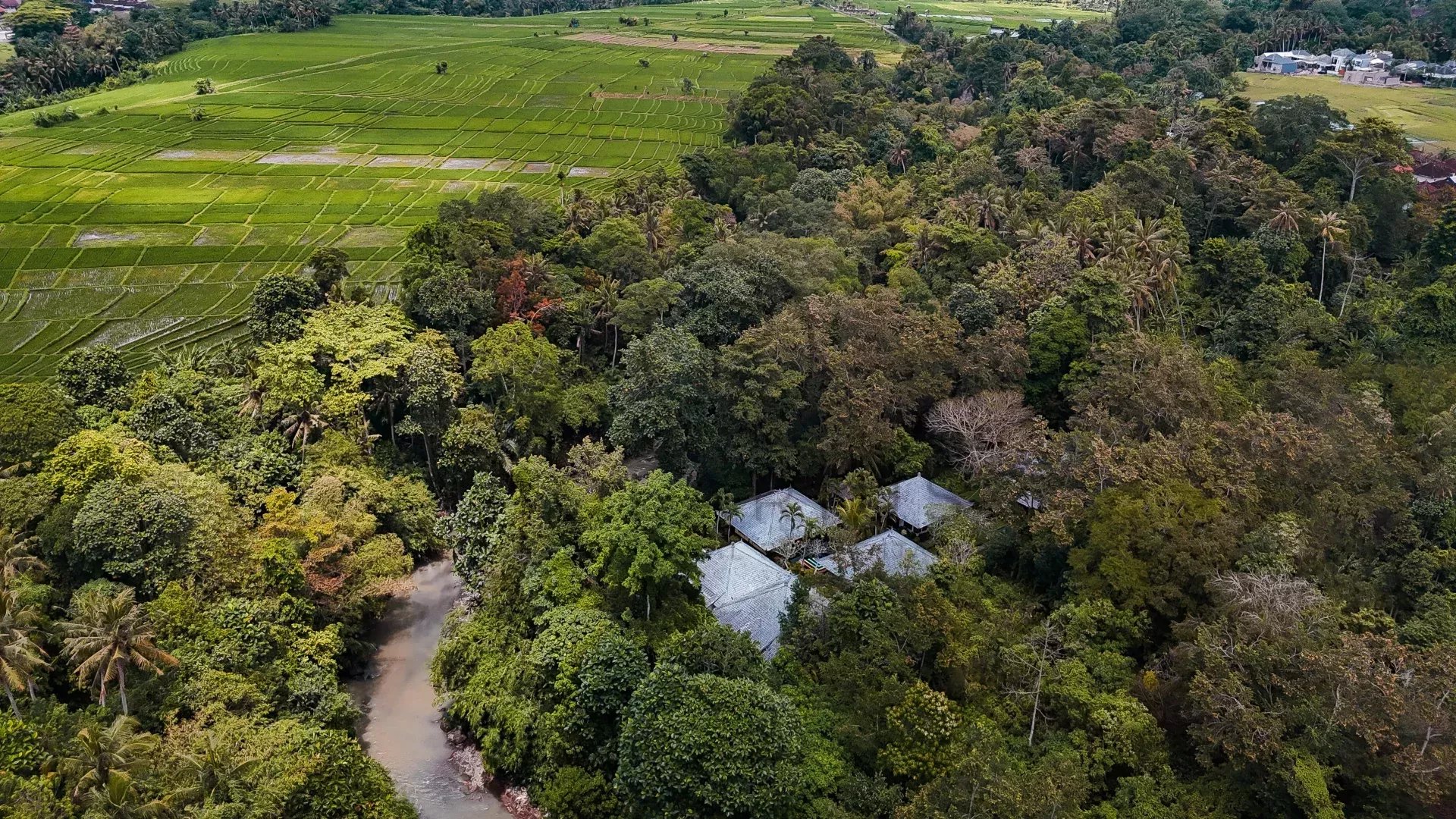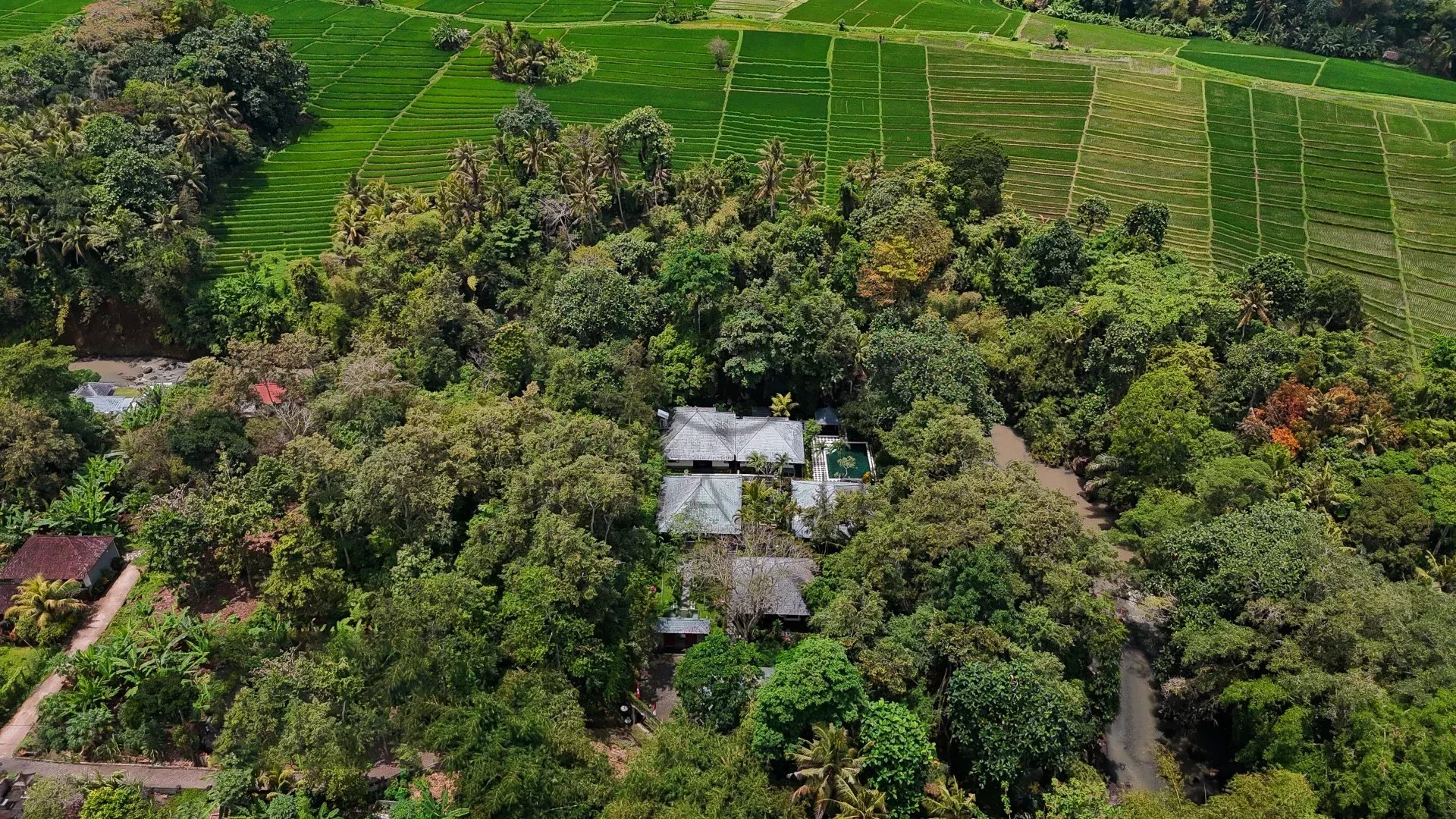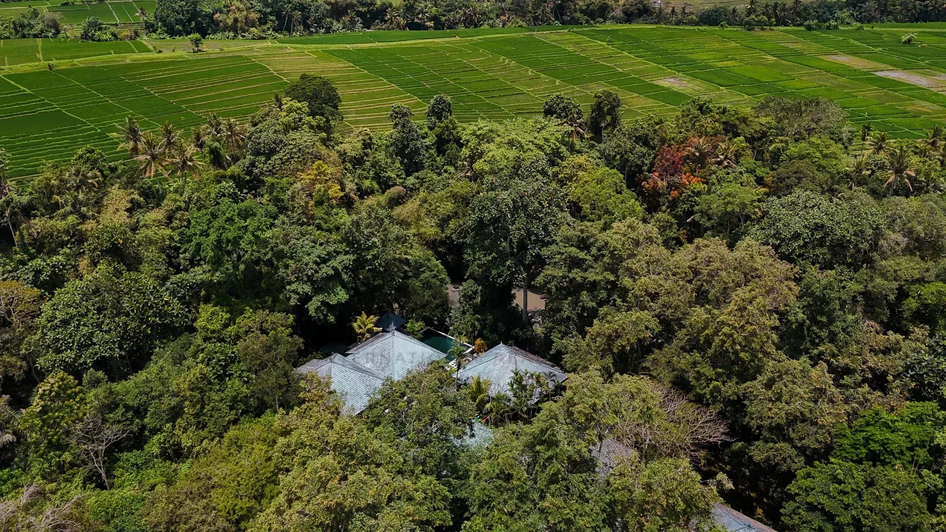 Das Anwesen liegt auf einem 4.350 m² großen Grundstück und bietet eine atemberaubende Kulisse, umgeben von tropischen Bäumen und an einer Ecke eines ewigen Flussufers gelegen, strategisch gesichert, um Balis faszinierende Naturschönheit zu bewahren.