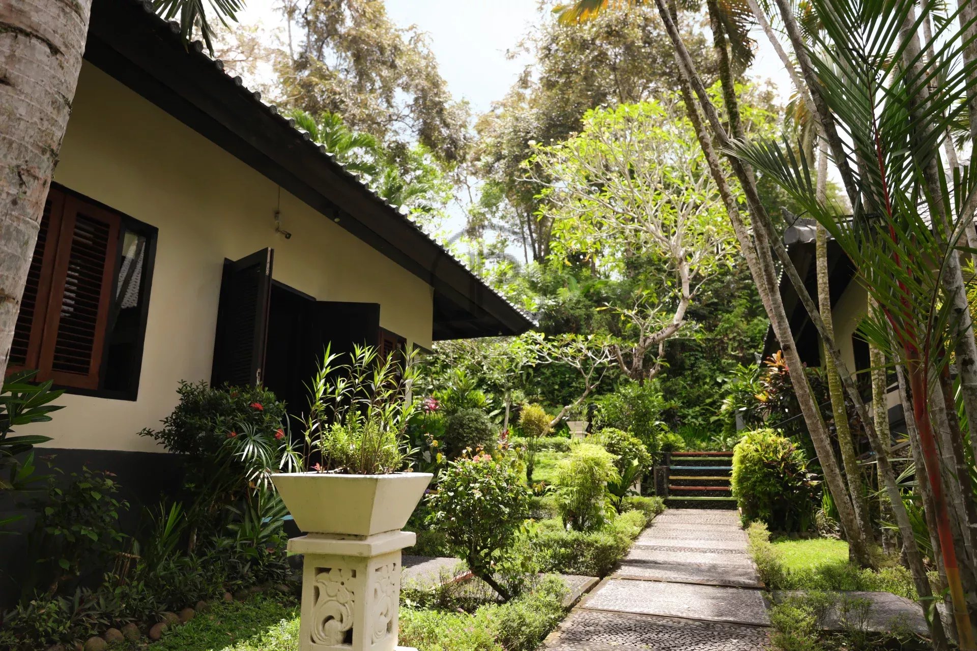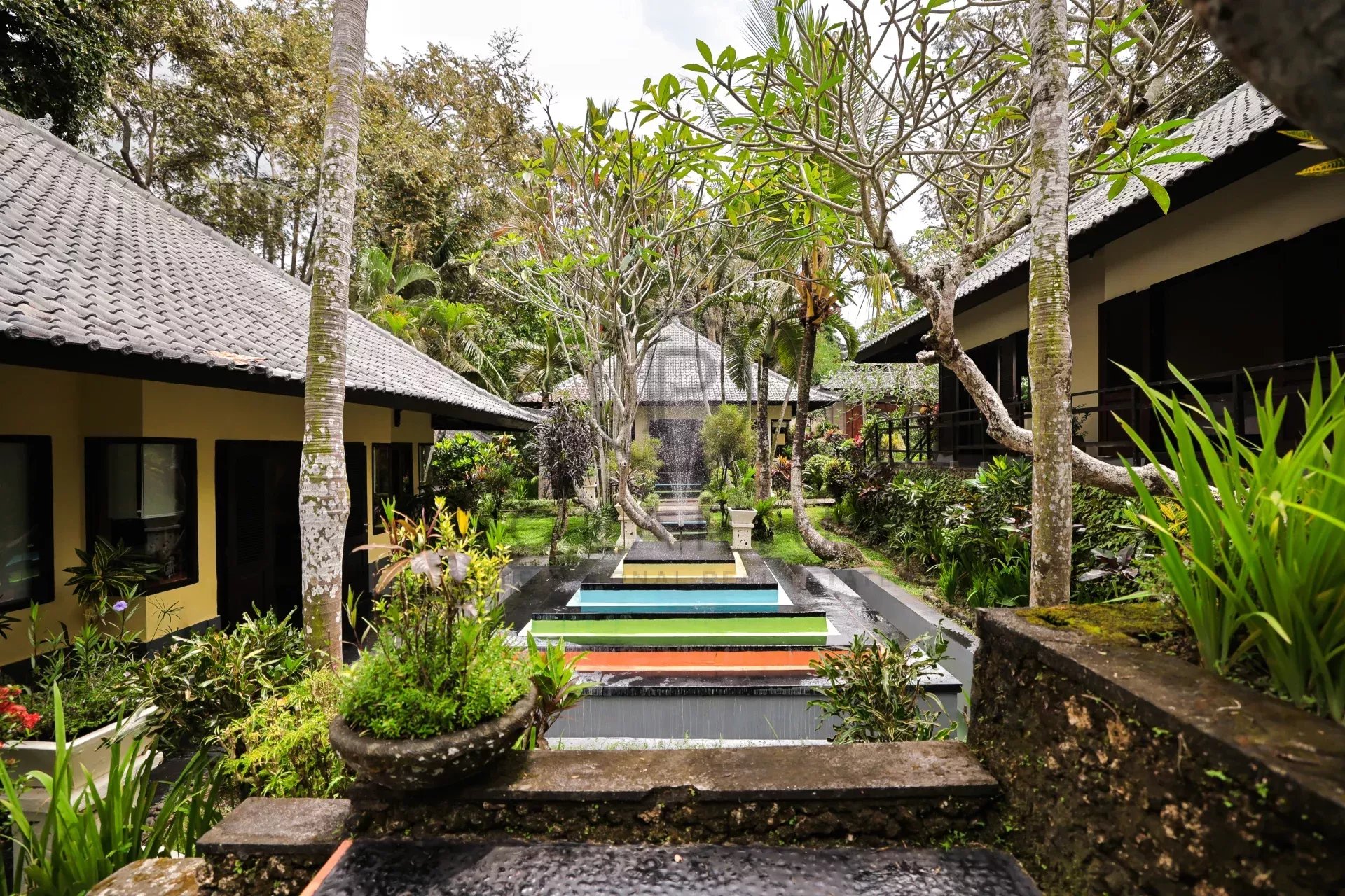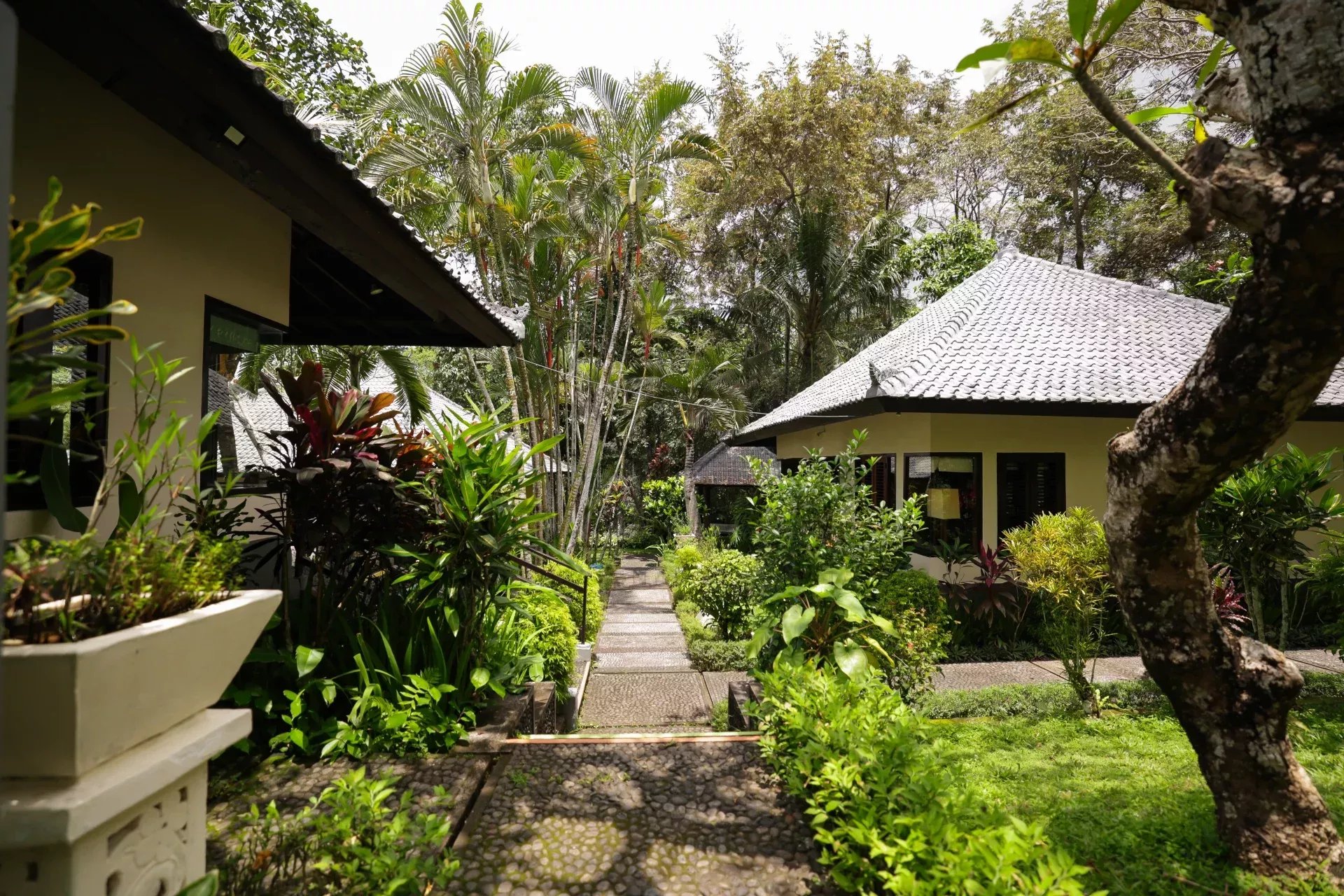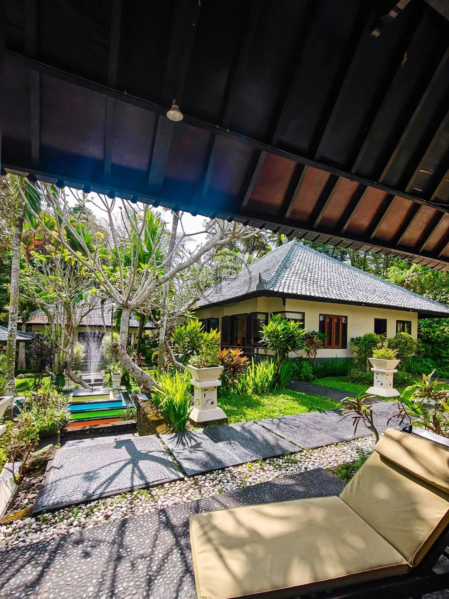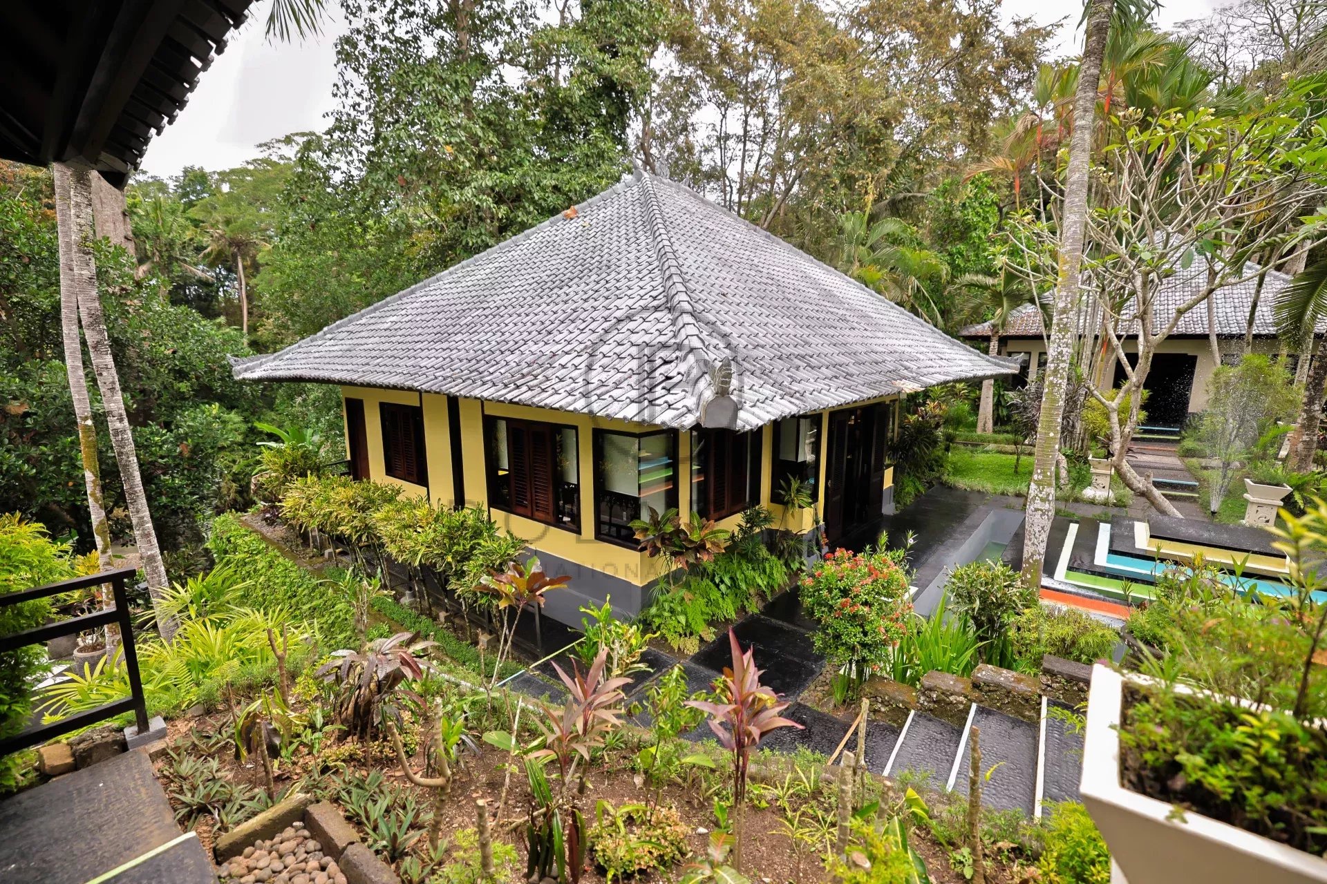 Das Anwesen liegt auf einem 4.350 m² großen Grundstück und bietet eine atemberaubende Kulisse, umgeben von tropischen Bäumen und an einer Ecke eines ewigen Flussufers gelegen, strategisch gesichert, um Balis faszinierende Naturschönheit zu bewahren.