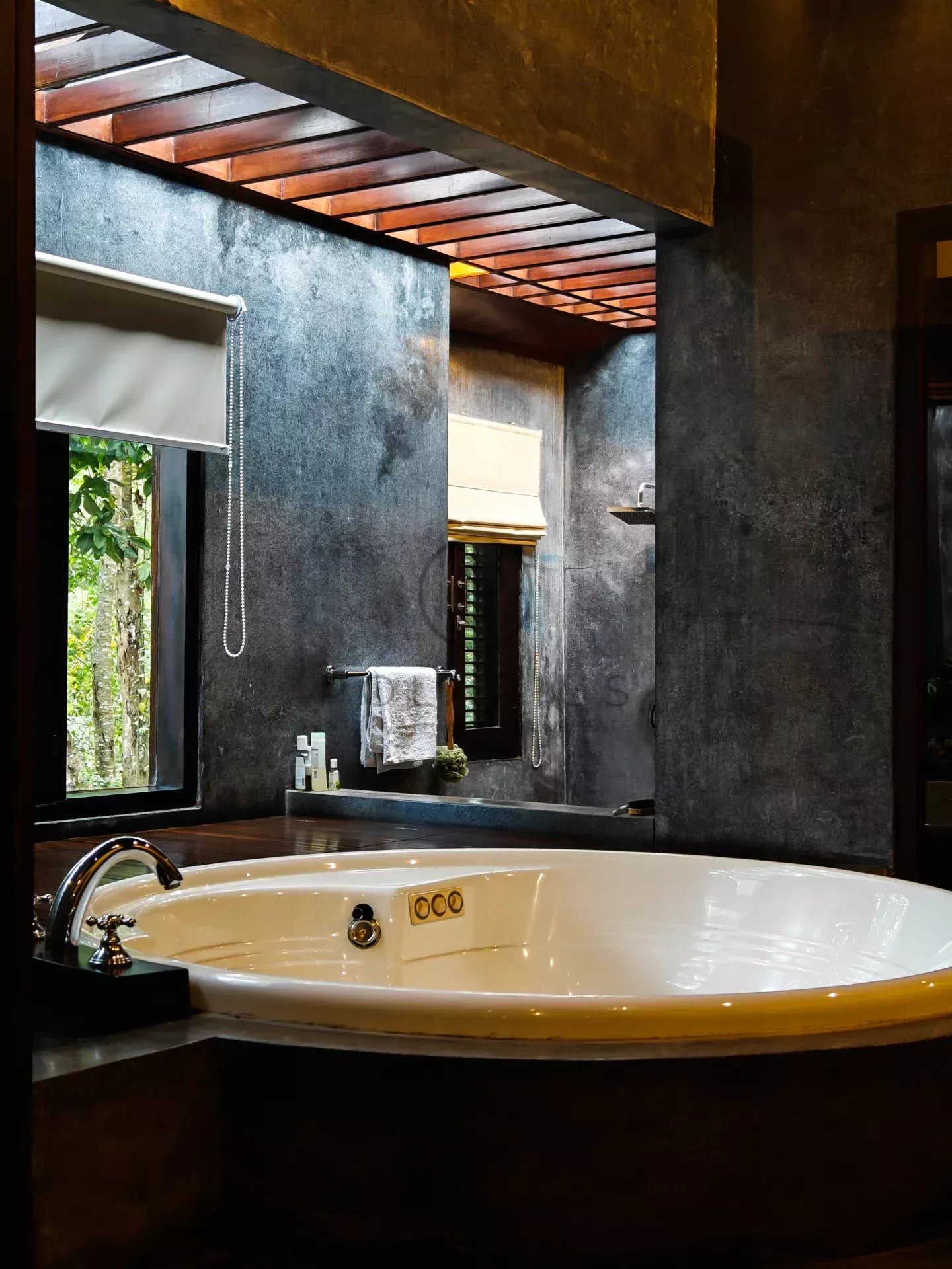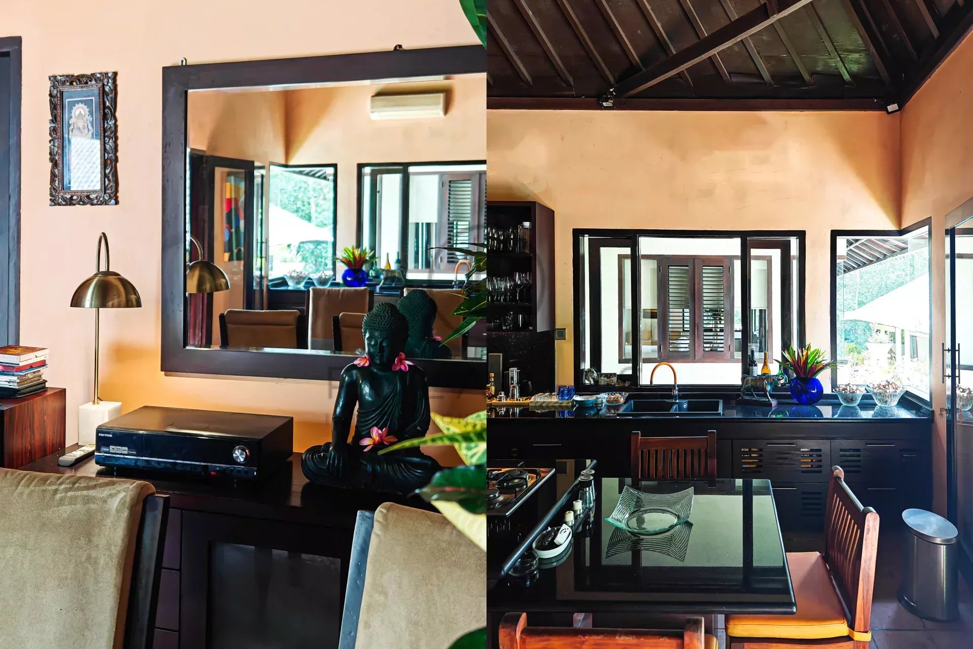 Das Design der Villa umfasst 5 separate Bungalows mit hohen Decken, Betonwänden und stilvollen Designermöbeln aus Teakholz, die dem Raum Eleganz und Einzigartigkeit verleihen.