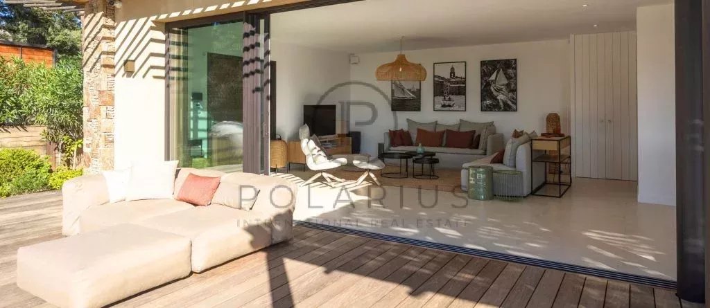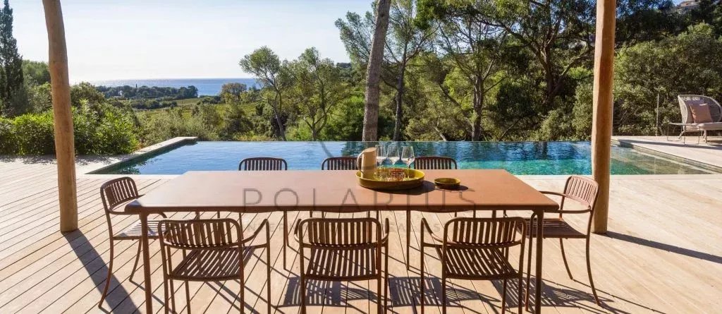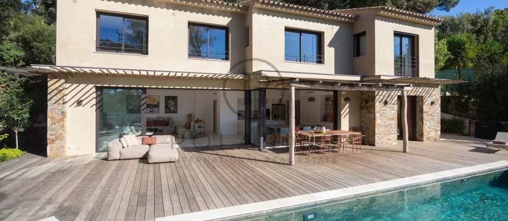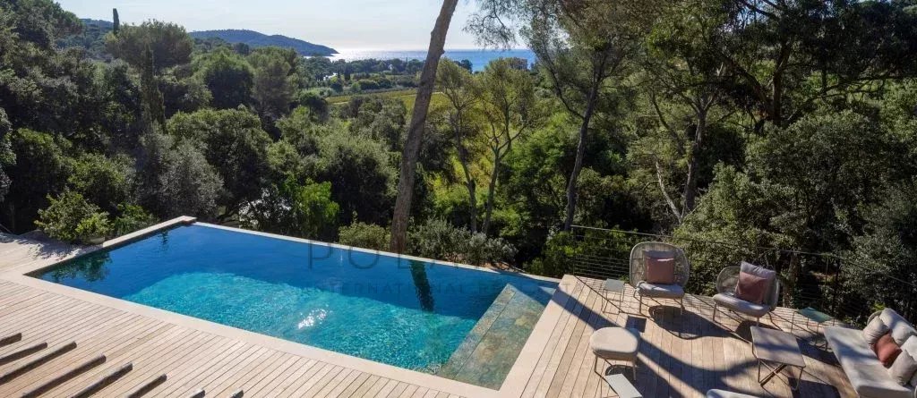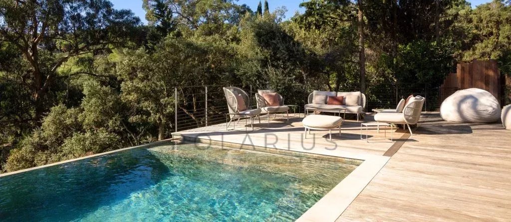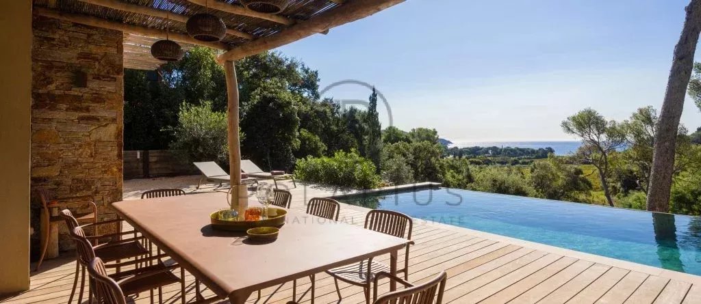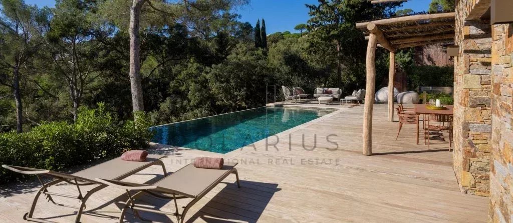 Hoch über den Weinbergen von La Croix-Valmer mit Panoramablick auf das Mittelmeer bietet diese helle und geräumige Luxusvilla in der Nähe des Strandes Gigaro einen unvergleichlichen Rückzugsort im Herzen der Côte d’Azur. Nur 1,3 km vom goldenen Sandstrand Plage de Gigaro entfernt, verbindet dieses ruhige Refugium mit fünf Schlafzimmern zeitlosen provenzalischen Charme mit moderner Küsteneleganz.