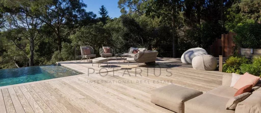 Umgeben von einem wunderschön angelegten, 2.000 m² großen Garten mit Olivenbäumen, Lavendel und Bougainvillea lädt die Villa Sie ein, die natürliche Schönheit der Côte d’Azur zu genießen.