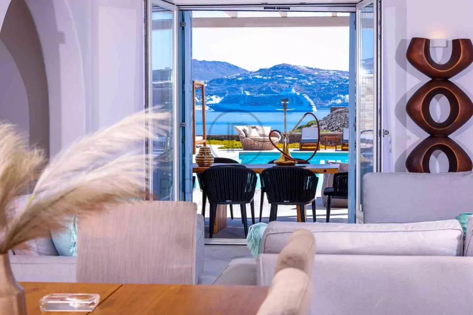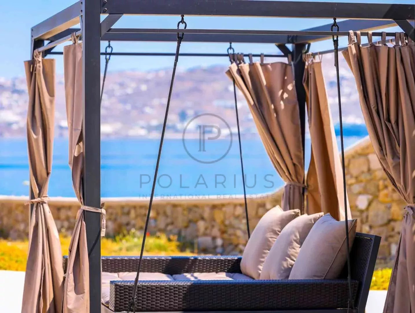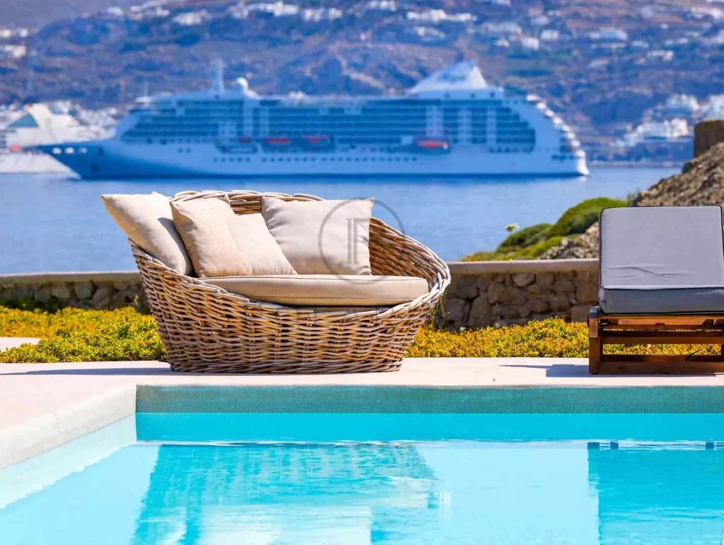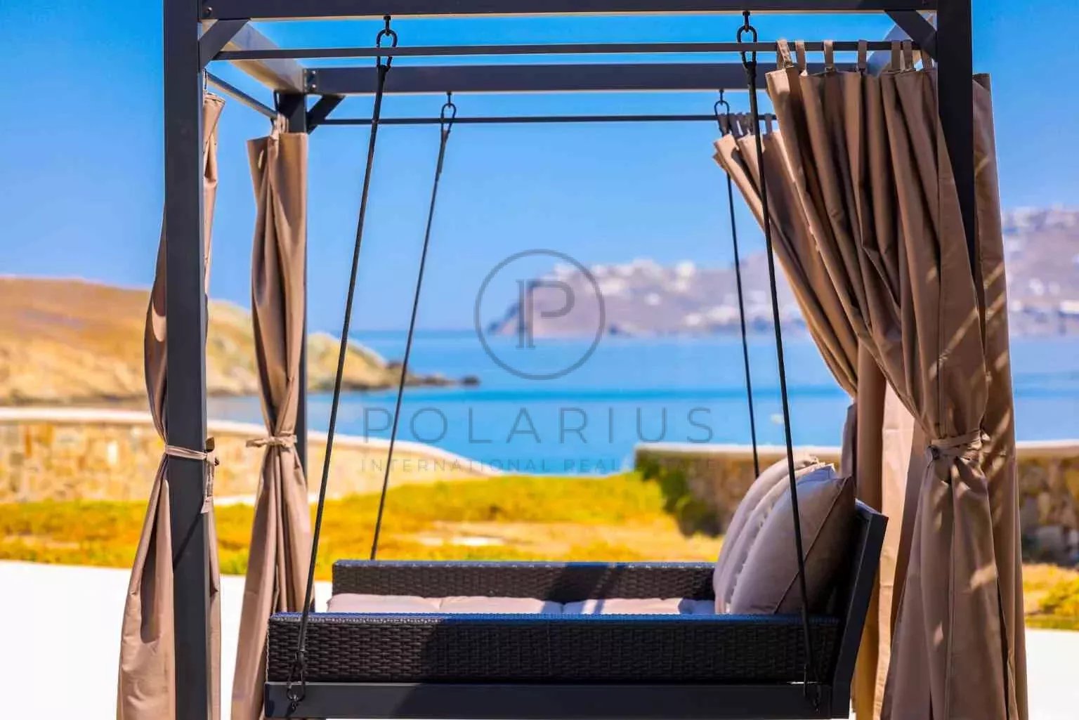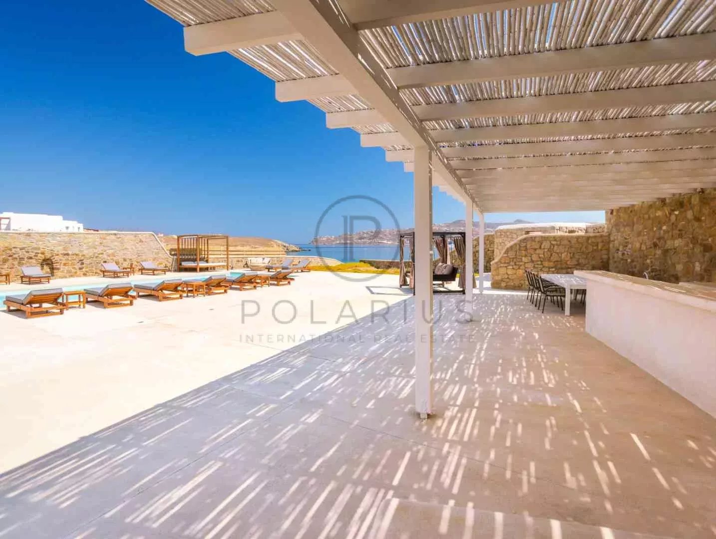 Klarer blauer Himmel und ein Privatstrand mit kristallklarem Wasser, so weit das Auge reicht, umgeben Sie von eleganten und geräumigen Loungebereichen sowie der kykladischen Architektur der Villa. Der Außenbereich erfüllt einfach in jeder Hinsicht jedes individuelle Bedürfnis in einer oasenartigen Umgebung. Das Deck schwebt fast über den Wellen und ist mit Sonnenliegen ausgestattet, ideal für Freizeittage, an denen Sie die Sonne genießen können. Ihre einzige Aufgabe besteht darin, am fantastischen Pool zu entspannen und Ihren Sinnen zu erlauben, sich von indiskreten Blicken zu befreien