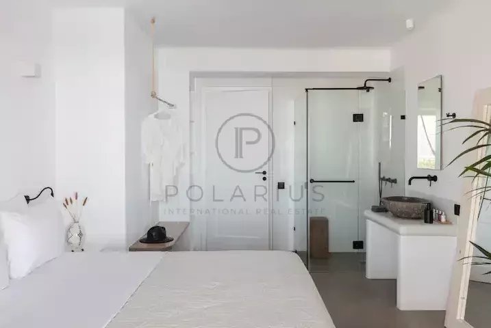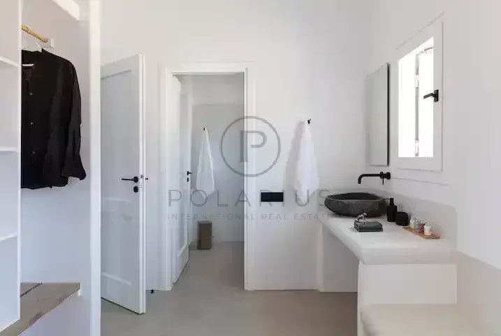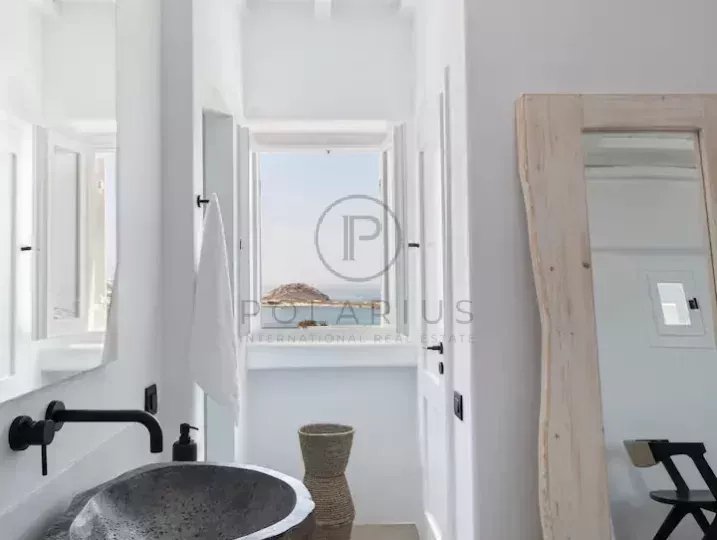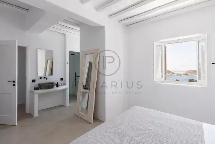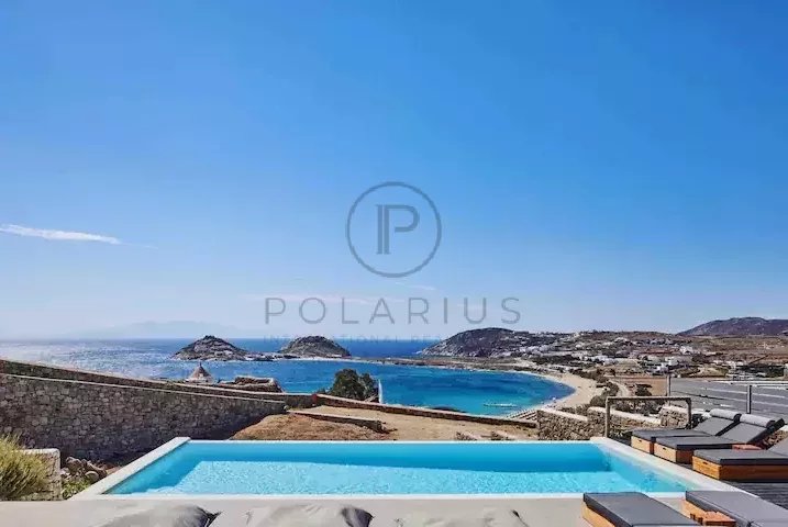Panorámica y sin obstáculos, la maravillosa vista de la famosa playa de Kalafatis le espera en la villa de nueva construcción. Relaje sus ojos donde la arena dorada se encuentra con el azul del Egeo y sumérjase en la alegría de sus vacaciones exclusivas. Diseñado para ofrecer a los huéspedes lo máximo en estilo de vida relajado, comodidad y privacidad en medio de la cosmopolita Mykonos, aquí no se ha pasado por alto ningún detalle.