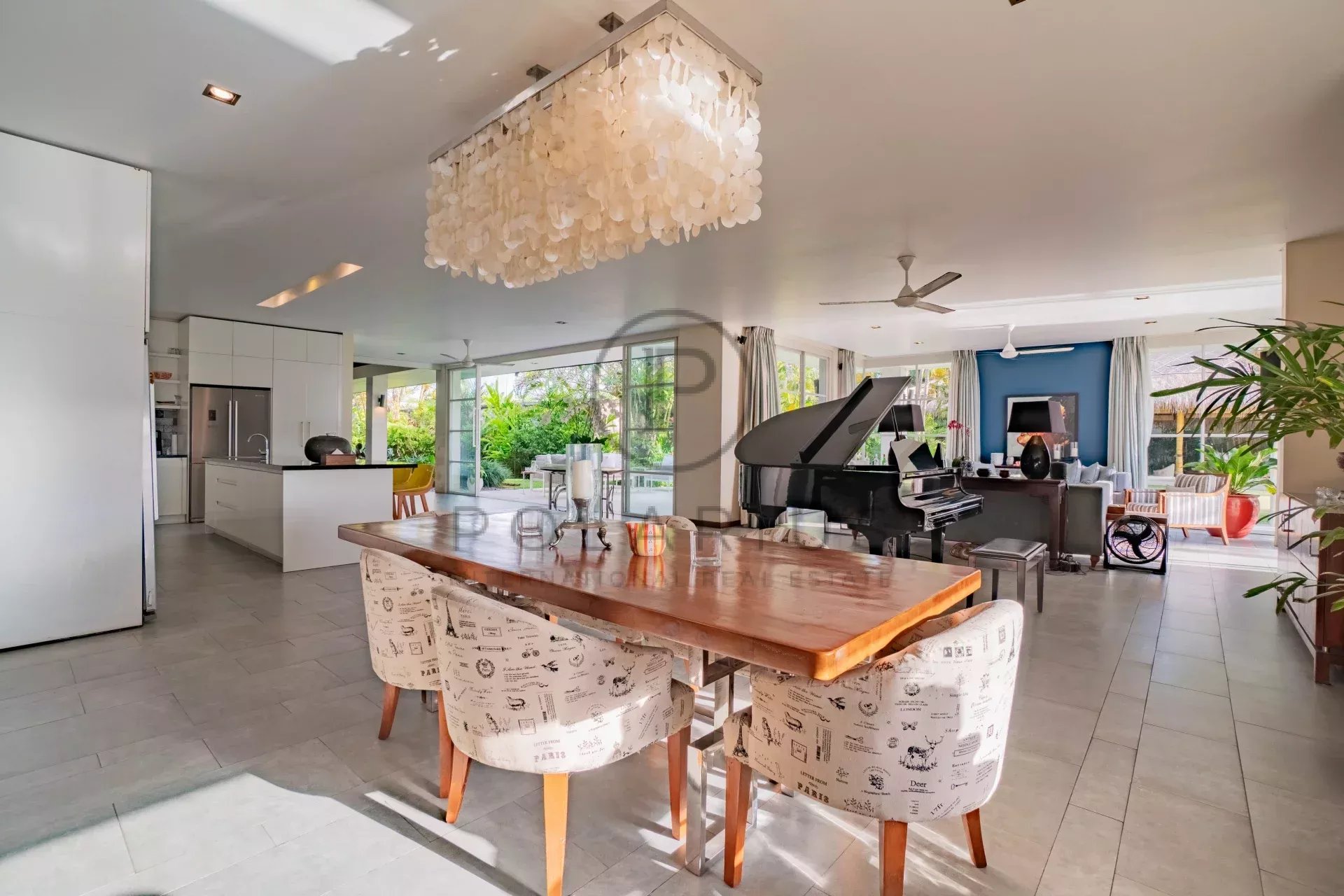 Les espaces intérieurs déclinent une élégance contemporaine et une atmosphère tropicale détendue. La cuisine sur mesure communique avec les espaces repas et salon, entièrement climatisables ou ouverts sur l’extérieur.