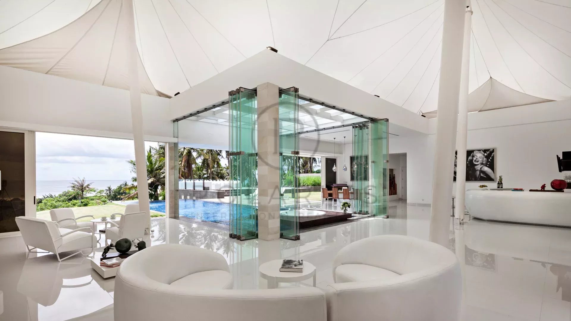 Les espaces de vie et salle à manger de la villa sont soigneusement conçus pour célébrer la vue sur l'océan, parfaitement encadrés par de grandes fenêtres et des portes coulissantes en verre. Qu'il s'agisse d'un café matinal tranquille ou d'un grand dîner, le cadre promet d'offrir une expérience tout simplement magique.