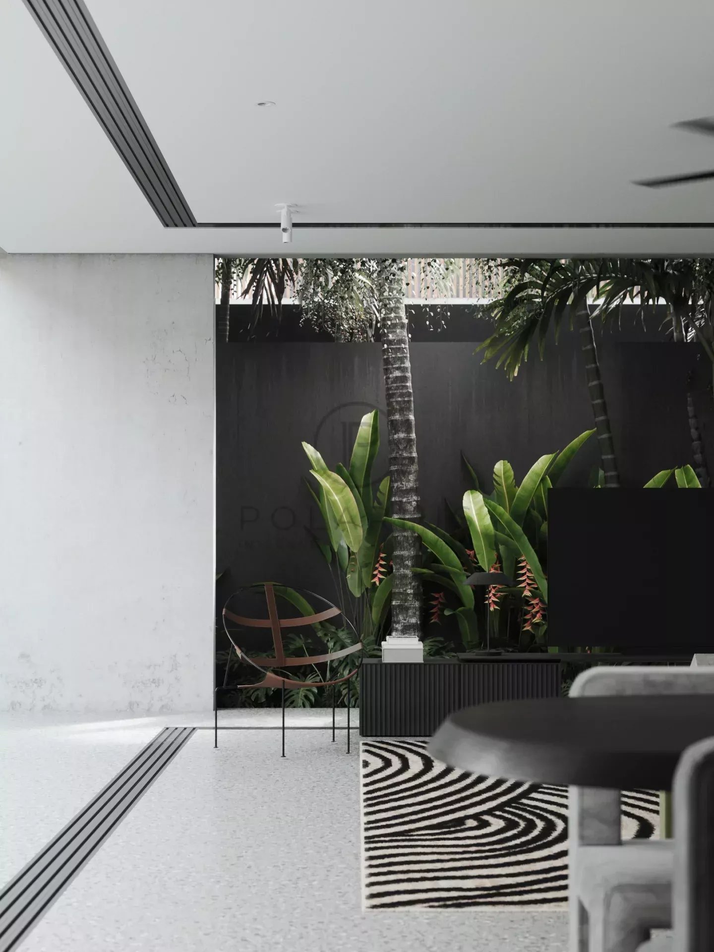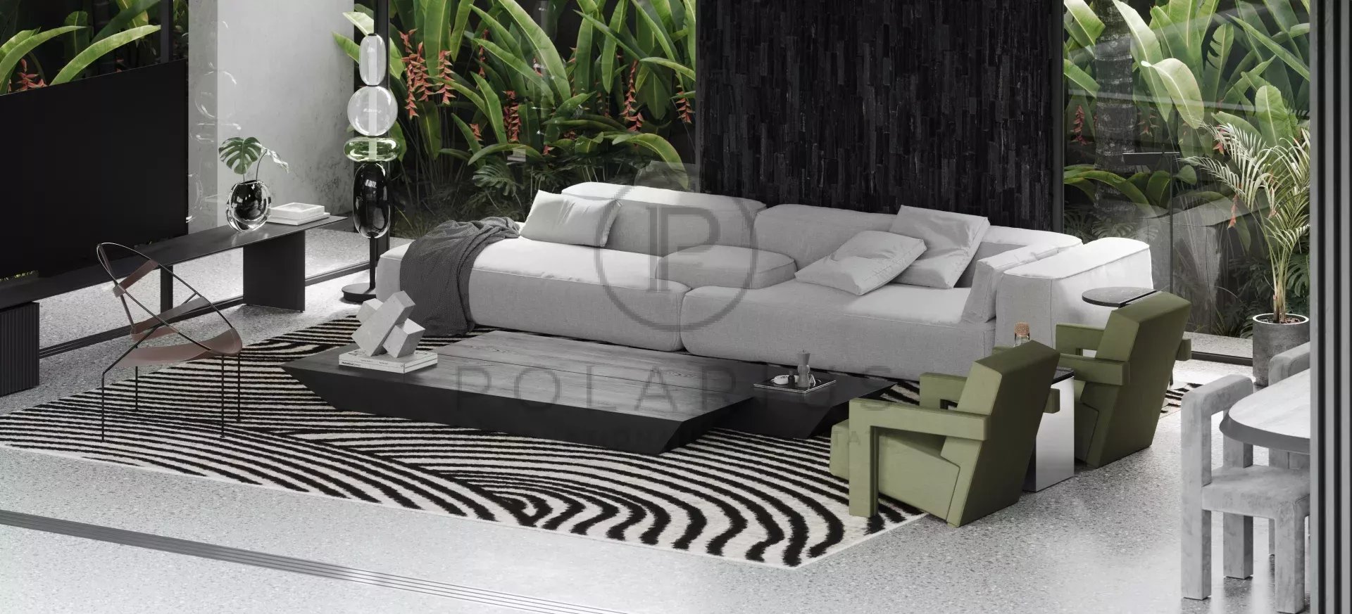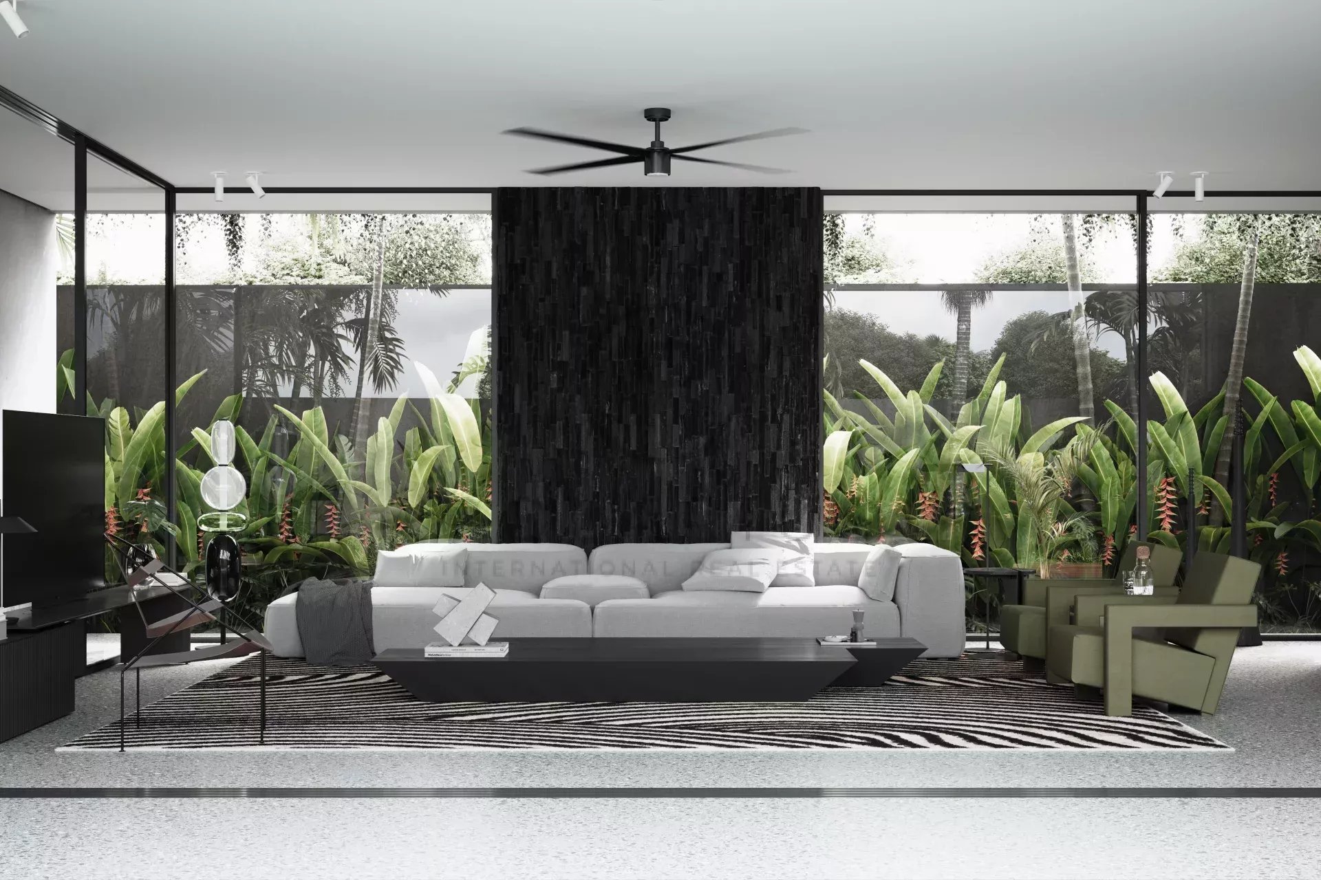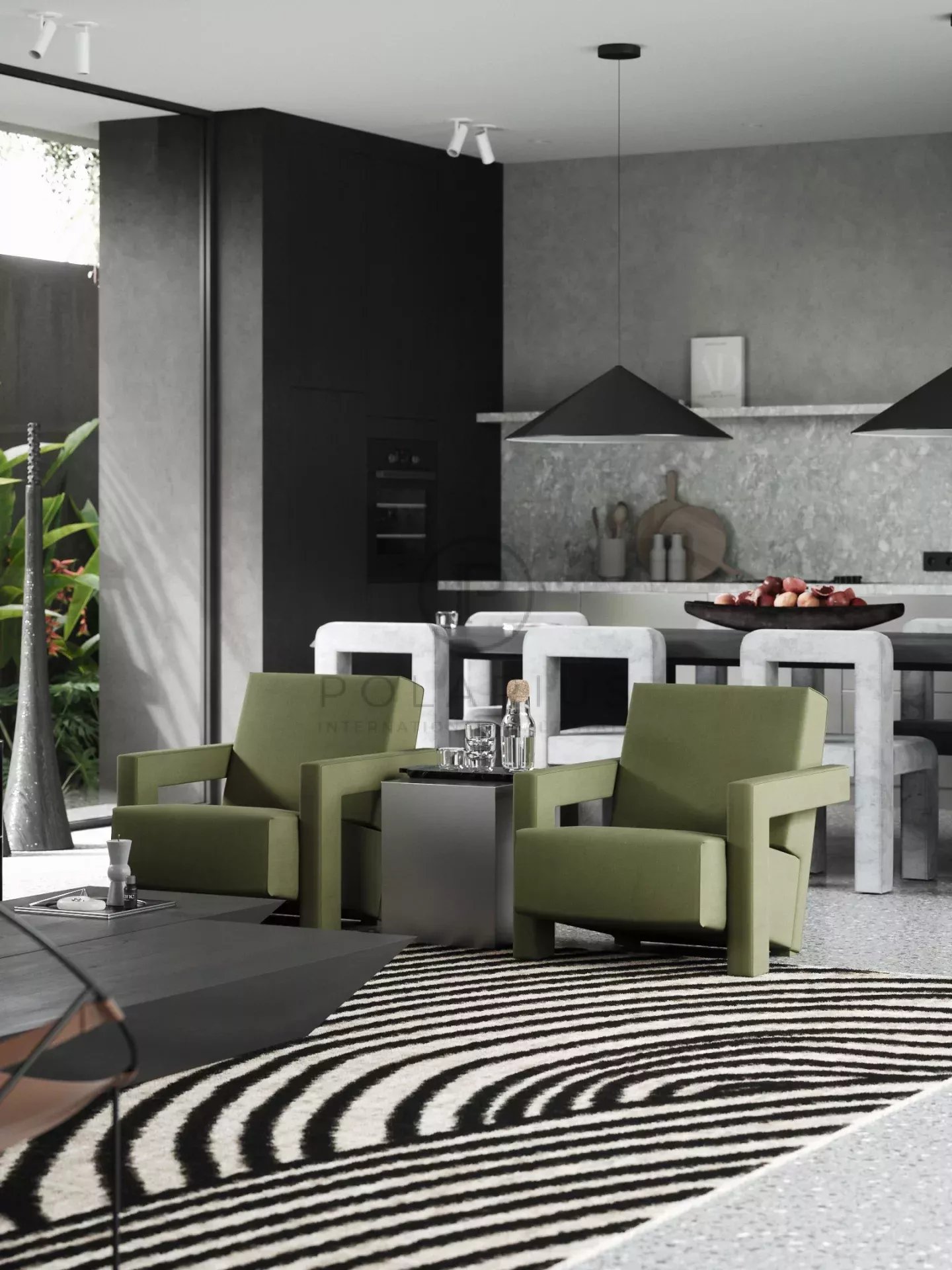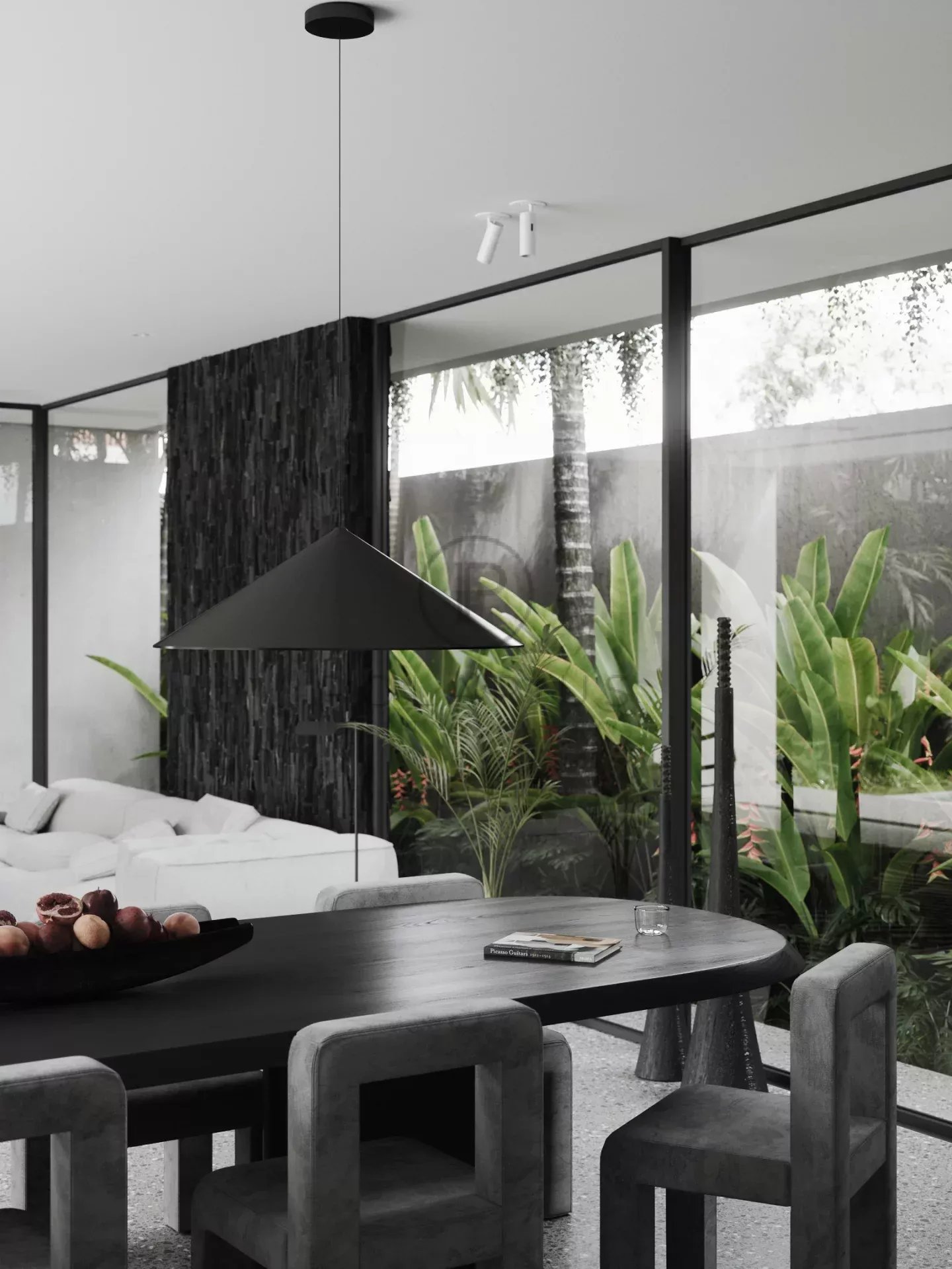 Les éléments de décoration comprennent des pierres naturelles telles que le granit, le marbre et la lave noire, renforçant l'attrait esthétique.