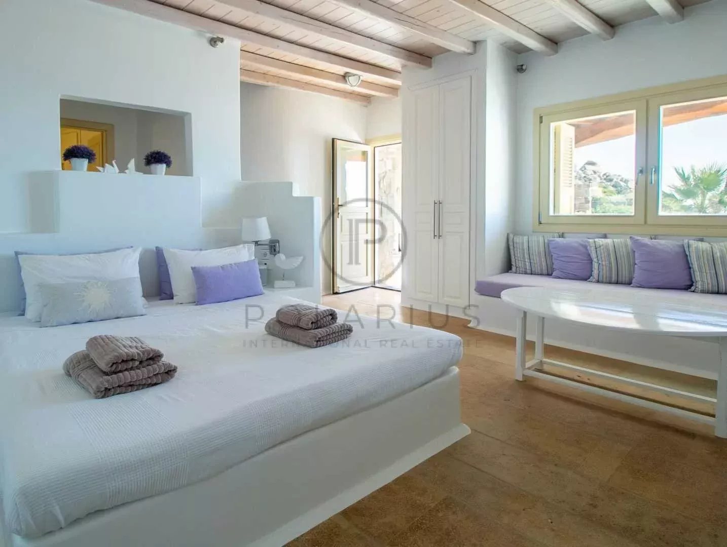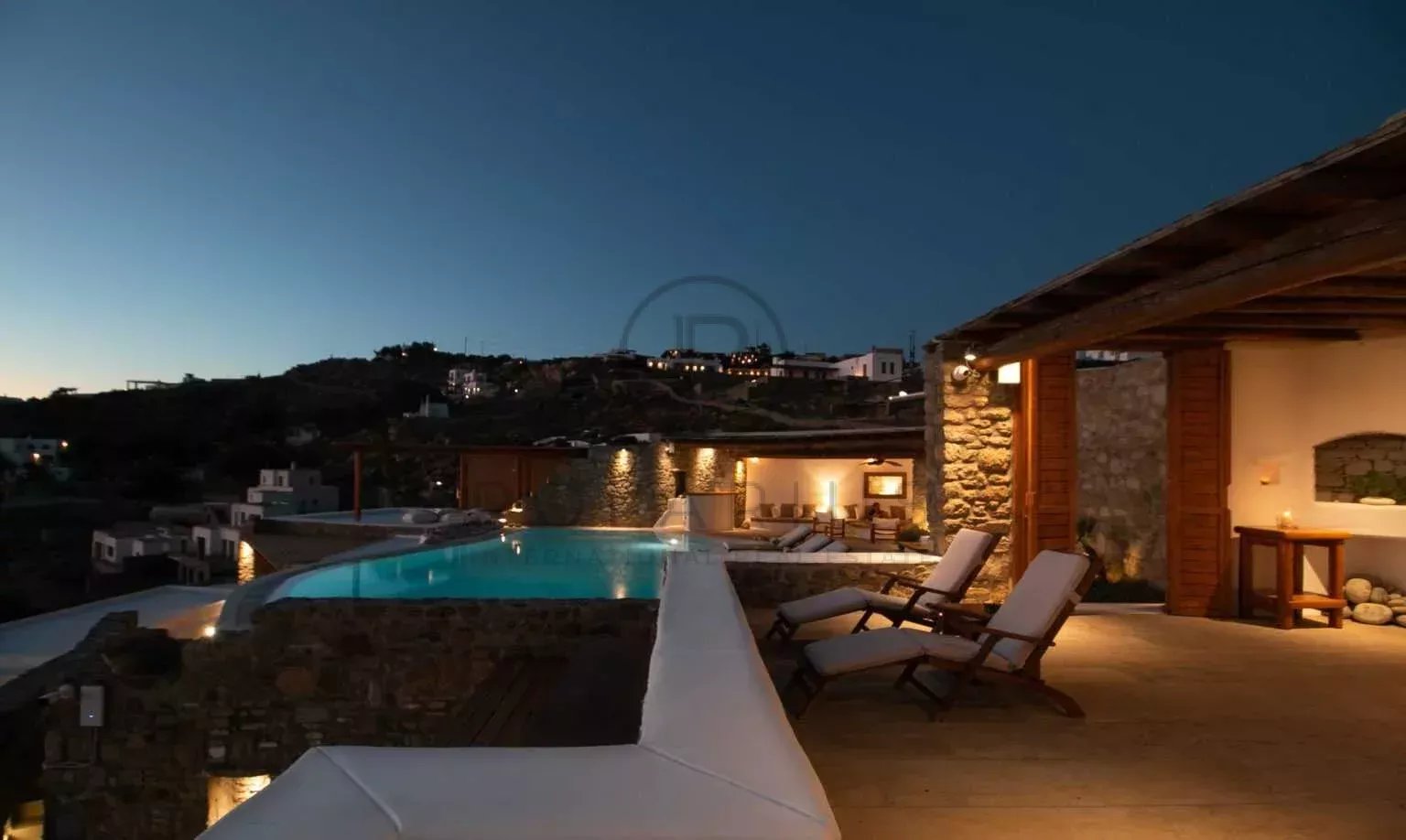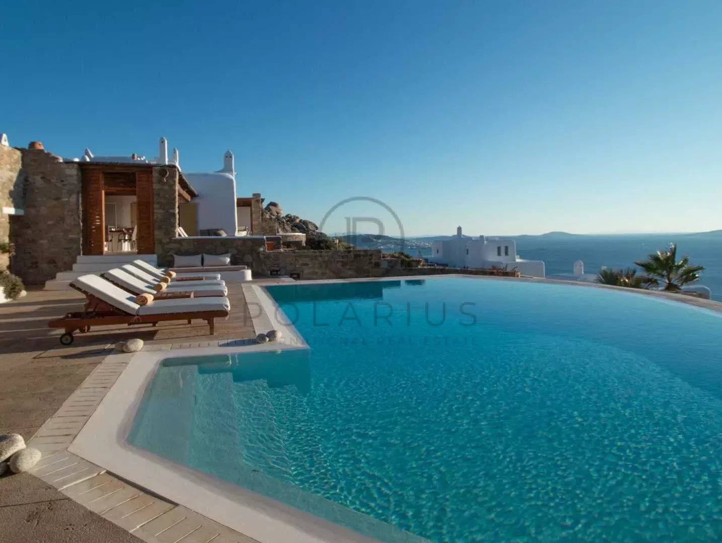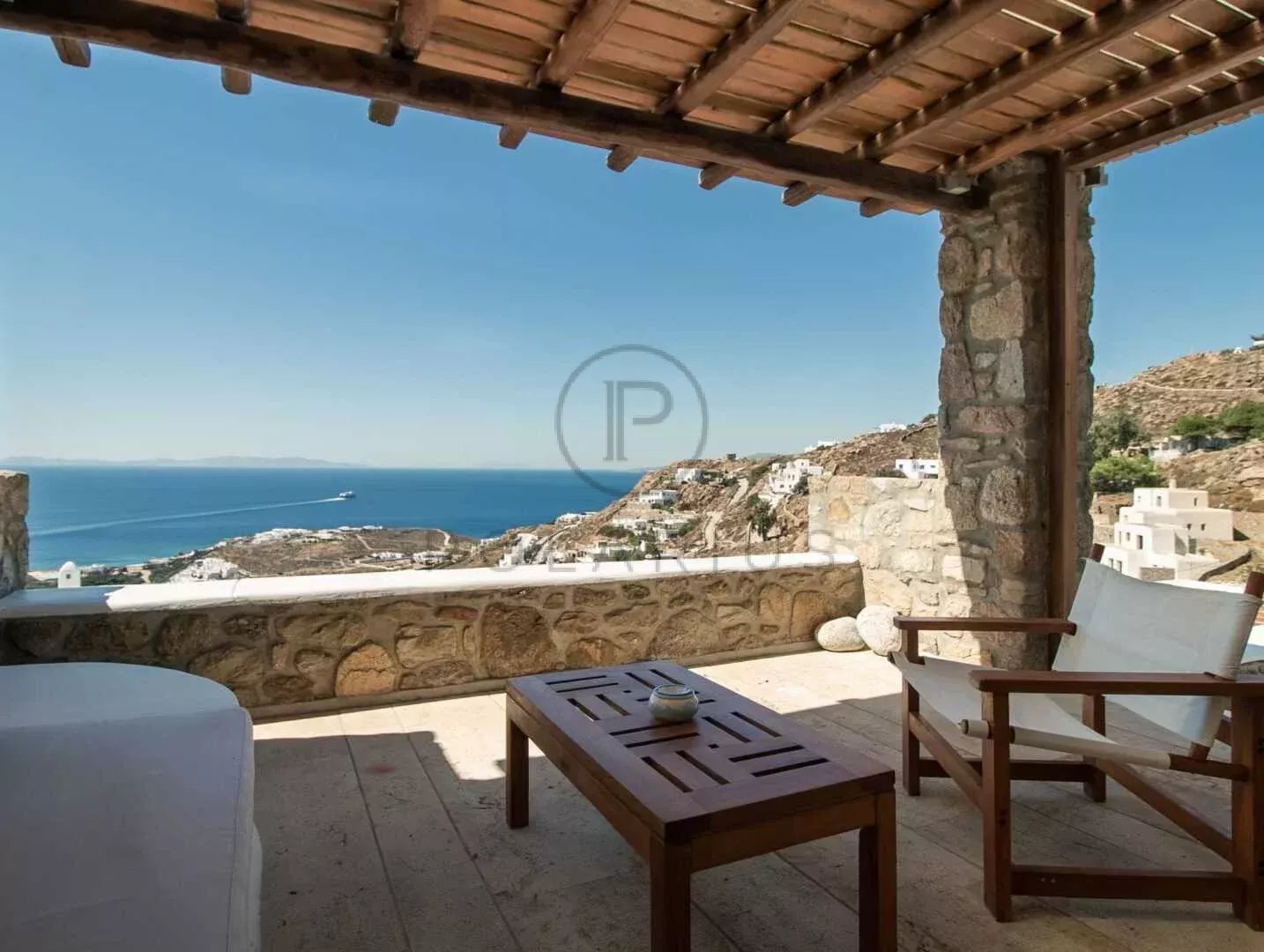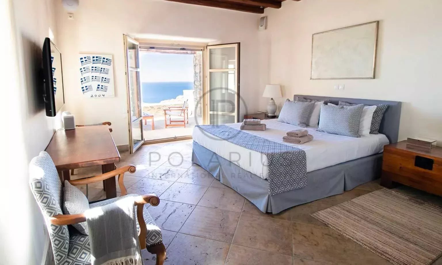 Situata nella zona privilegiata di Tourlos, a 6 minuti di auto dalla città di Mykonos, la villa fa parte di un complesso di due ville con eccezionale vista sul mare e sul tramonto.