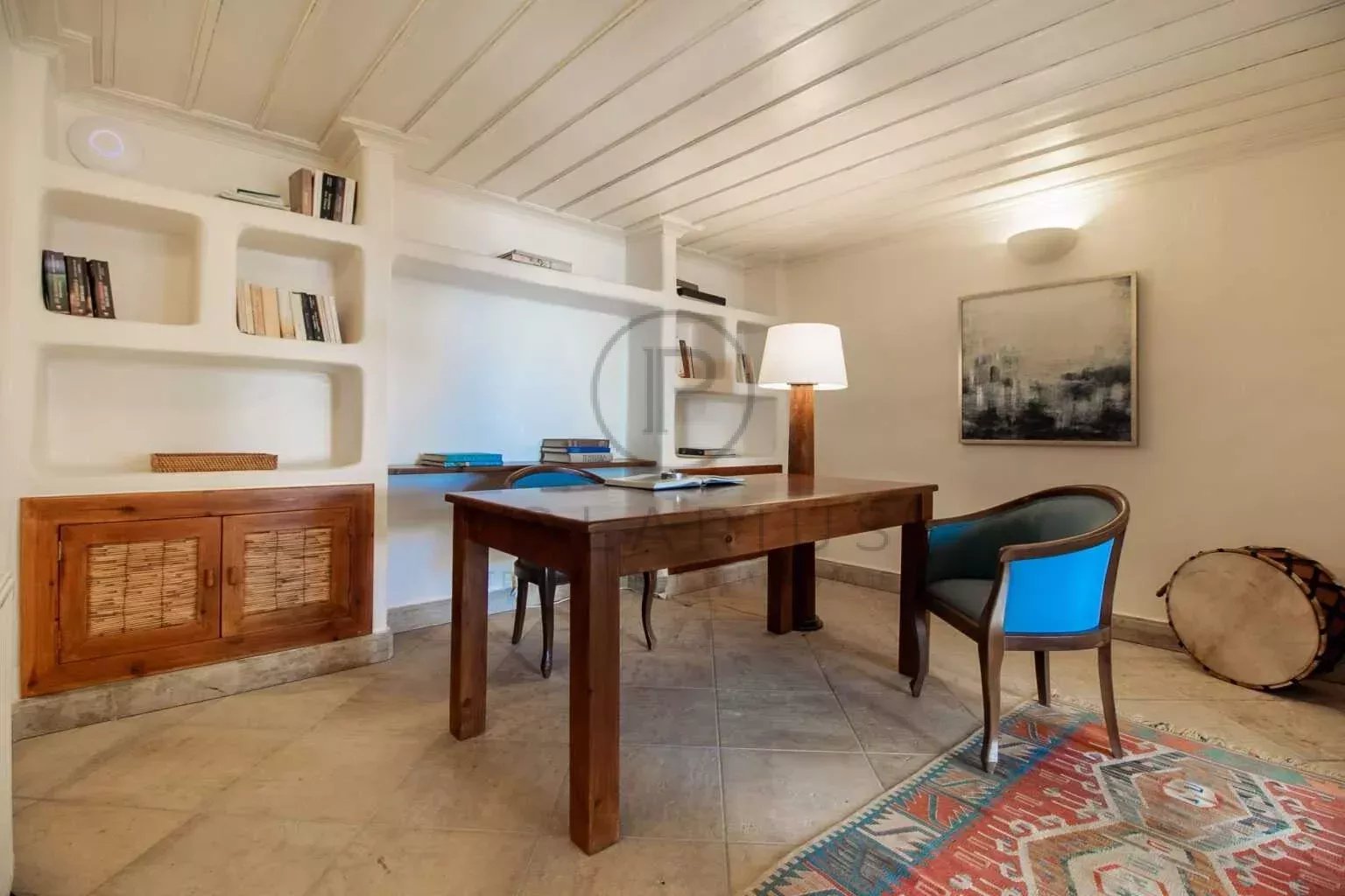 Piano inferiore: due camere ospiti con letti matrimoniali, aria condizionata, bagno privato con doccia, accesso al patio esterno, zona soggiorno vista mare, sala studio.