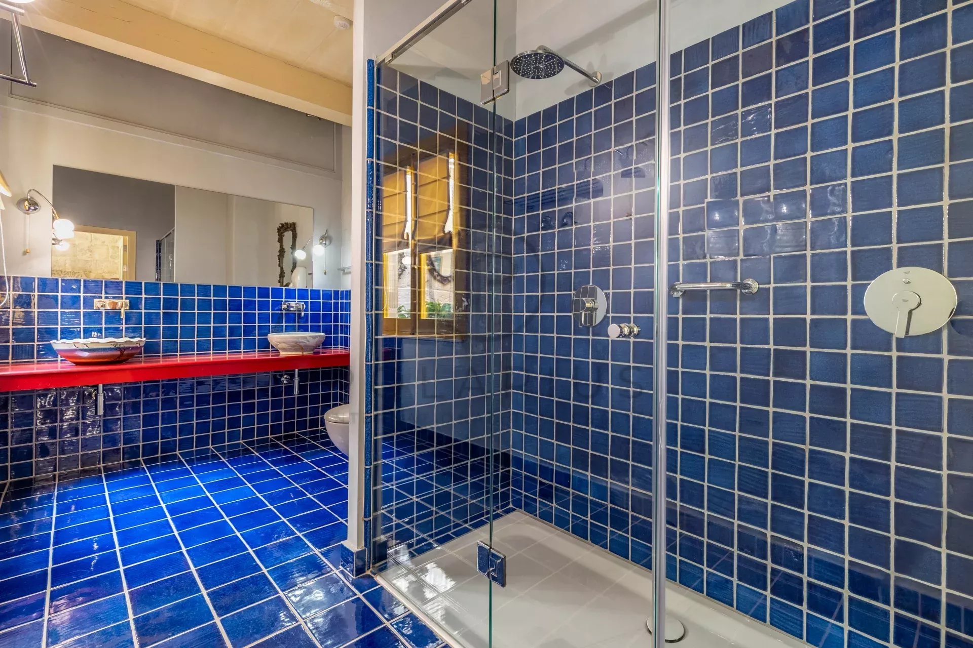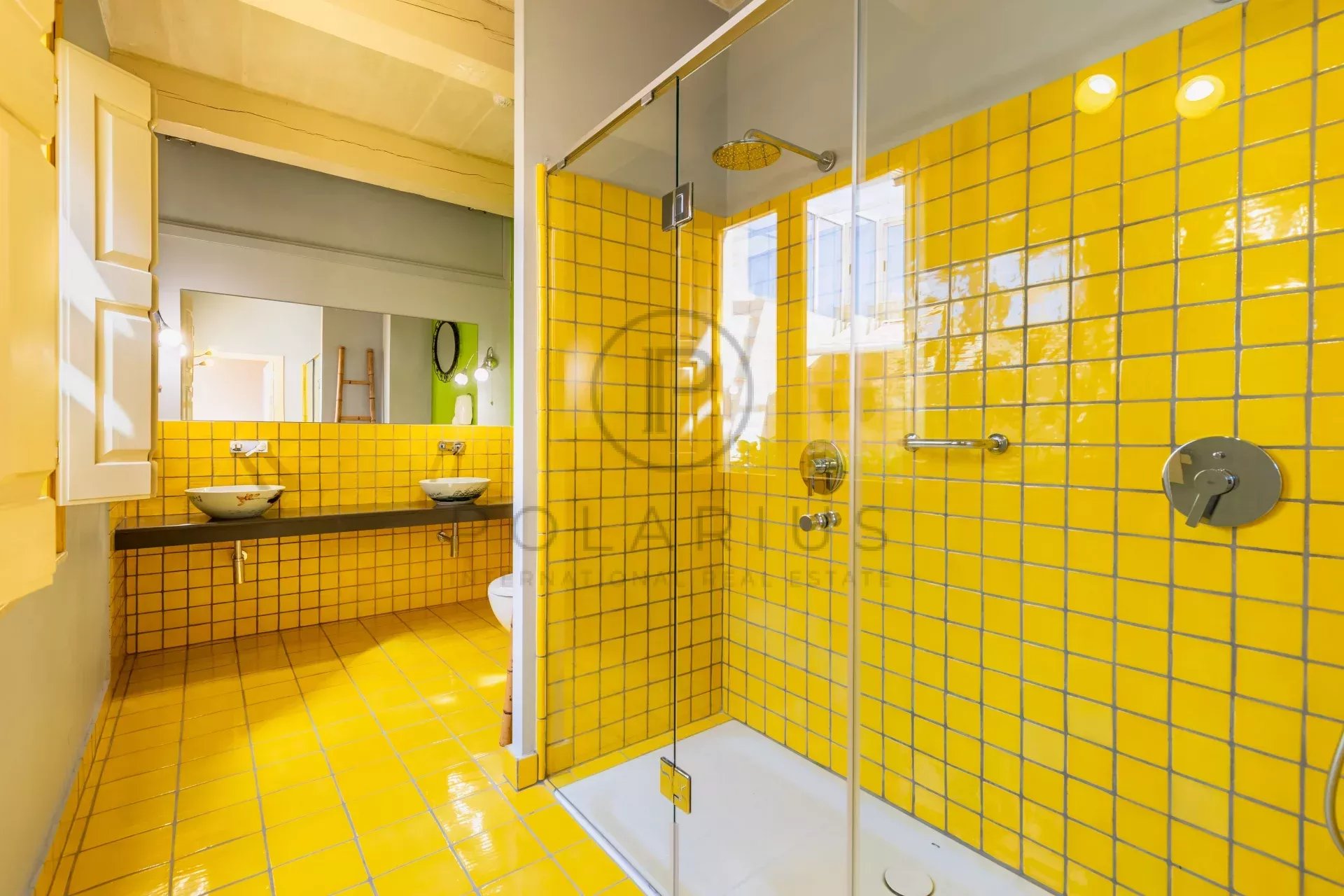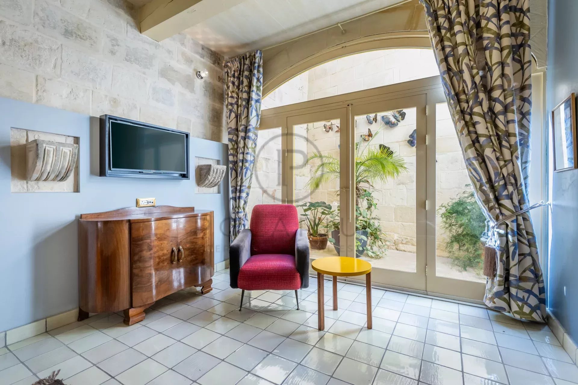 La maison dispone di due antipasti, l'ingresso principale mène in un imponente salone et salle à manger voûté, menant jusqu'au coin Cuisine. L'altro ingresso mène all'ascenseur, alla salle d'eau des invités e alla cour centrale bénéficiant d'un foyer au bois et d'un puits de lumière pouvant être fermé ou ouvert selon la season. Un imposant escalier à vis domine la cour et mène jusqu'au niveau des combles.