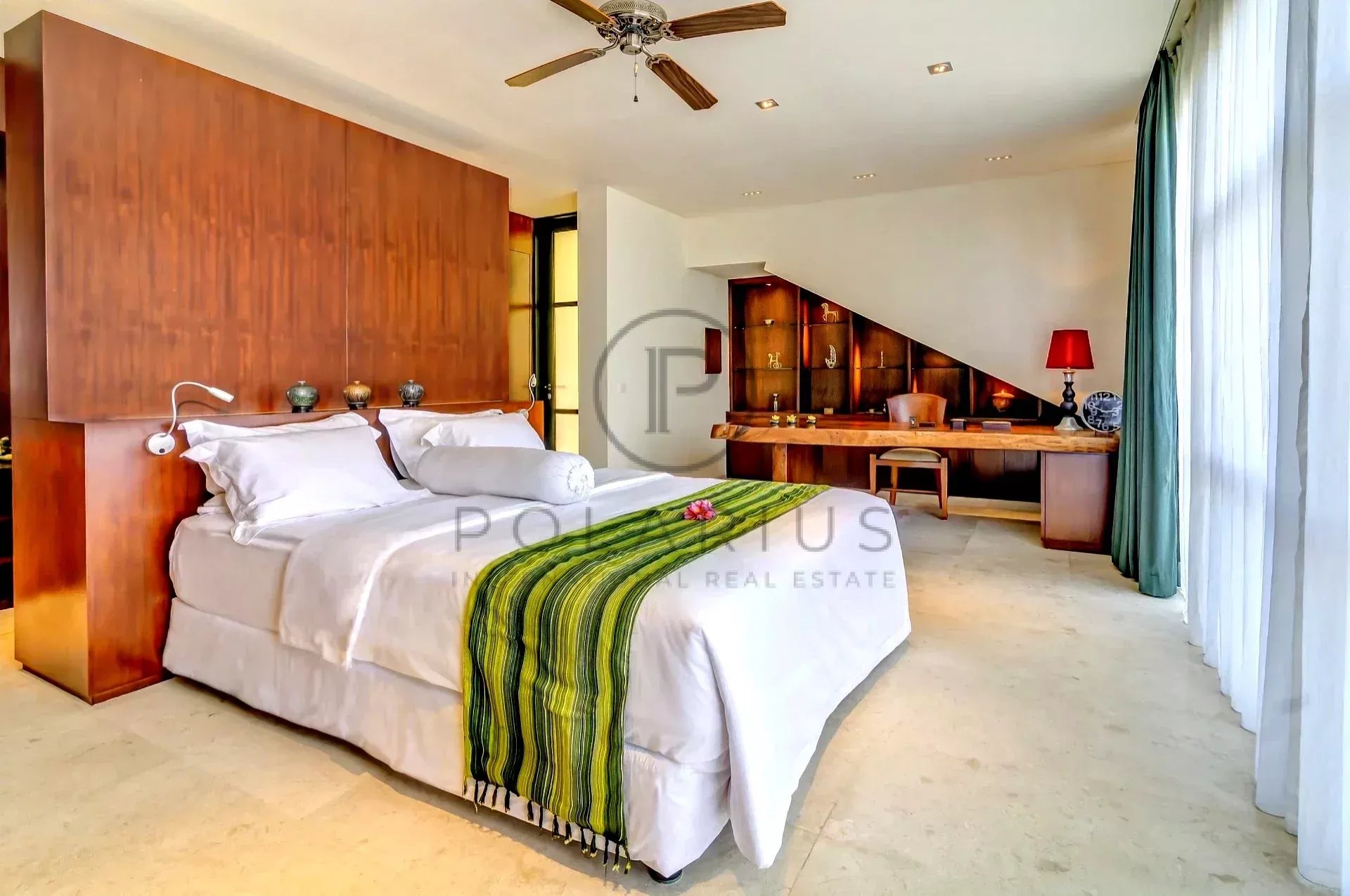 Это невероятное поместье класса люкс с 7 спальнями расположено на полуострове Букит на Бали, откуда открывается потрясающий вид на океан на 160°. Расположенное на участке земли площадью 1485 м² на краю утеса с площадью застройки 1202 м², это поместье сочетает японский дизайн с современной балийской архитектурой.