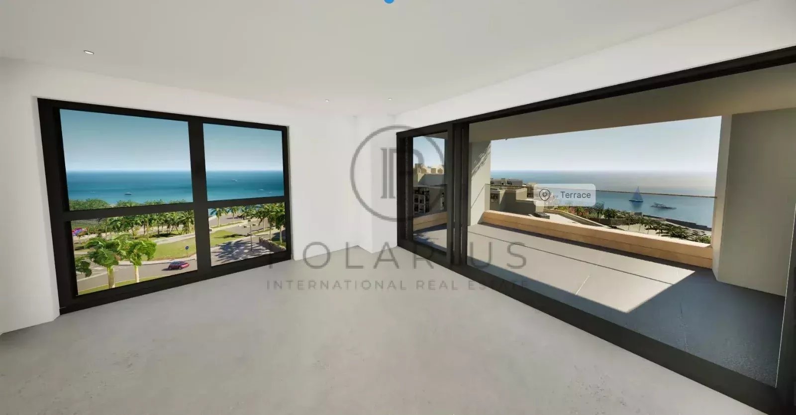 步入光线充足的开放式起居和用餐区,精心布局,最大限度地利用空间并提升功能性。落地窗通向私人露台,可一览周围天际线和远处地中海的壮丽景色。